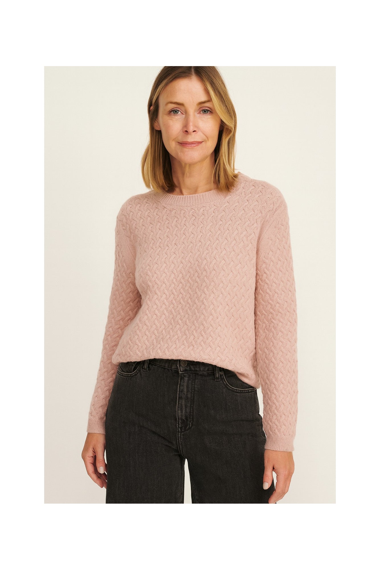 This cozy braided cable sweater features a silky, soft-touch yarn for comfortable wear. It has a crewneck design and falls around the hip, making it a versatile piece that can be effortlessly styled for both casual and dressier occasions.