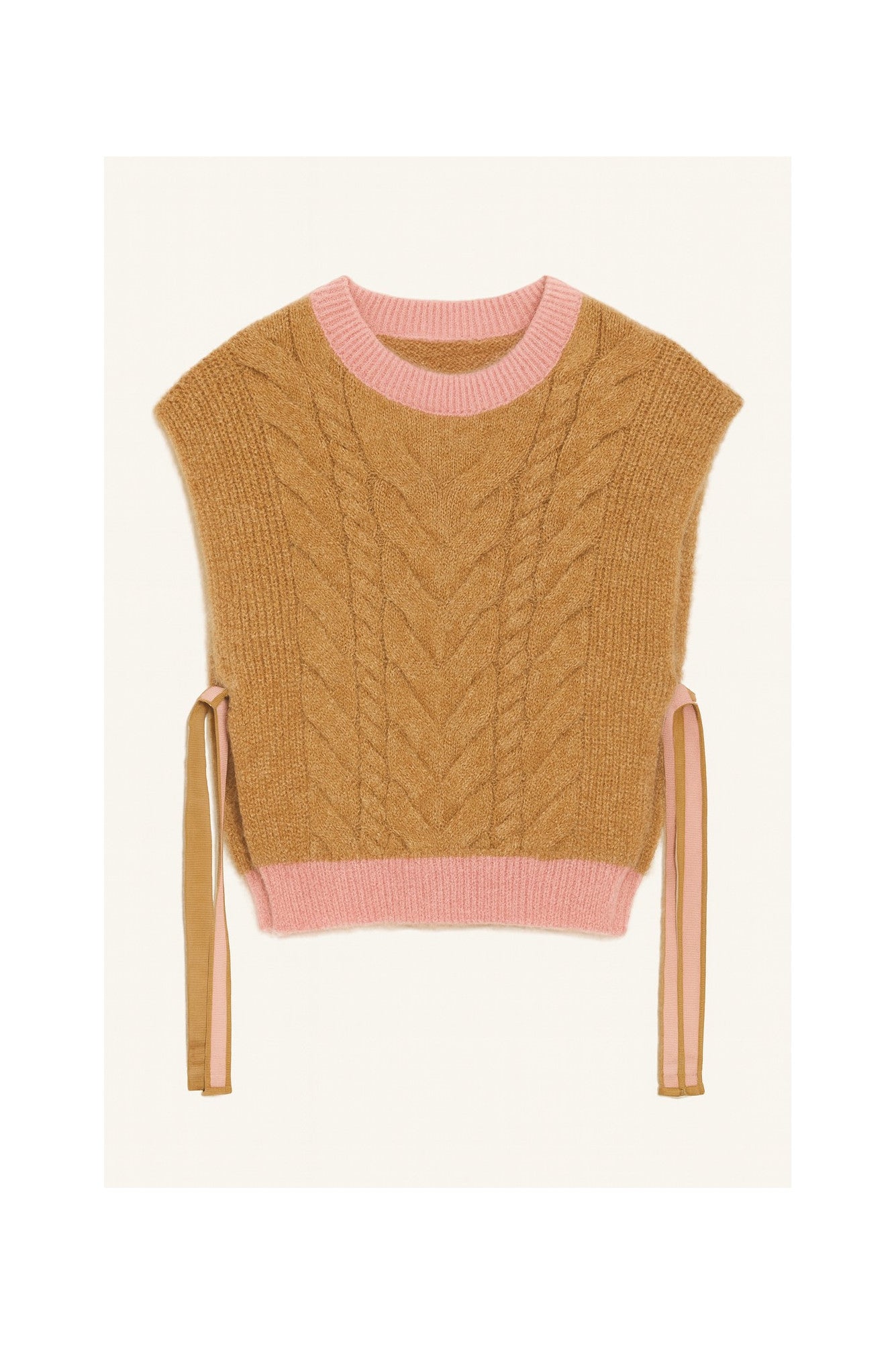 This cable vest features a luxuriously soft mohair blend, paired with a gentle cameo pink trim set against a timeless camel background. The open sides are enhanced with adjustable two-tone Grosgrain ties accented in pink, offering both comfort and a stylish touch.