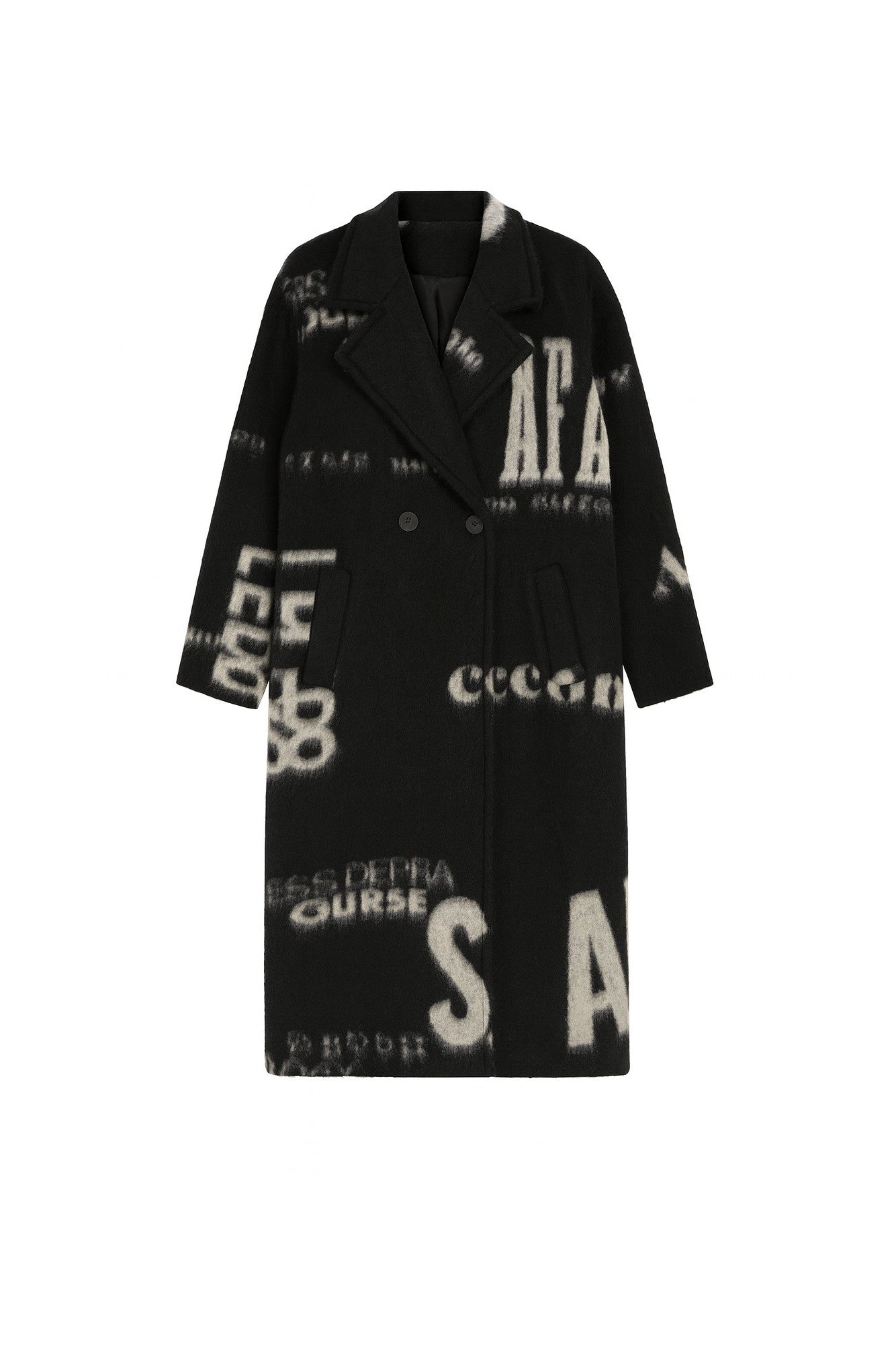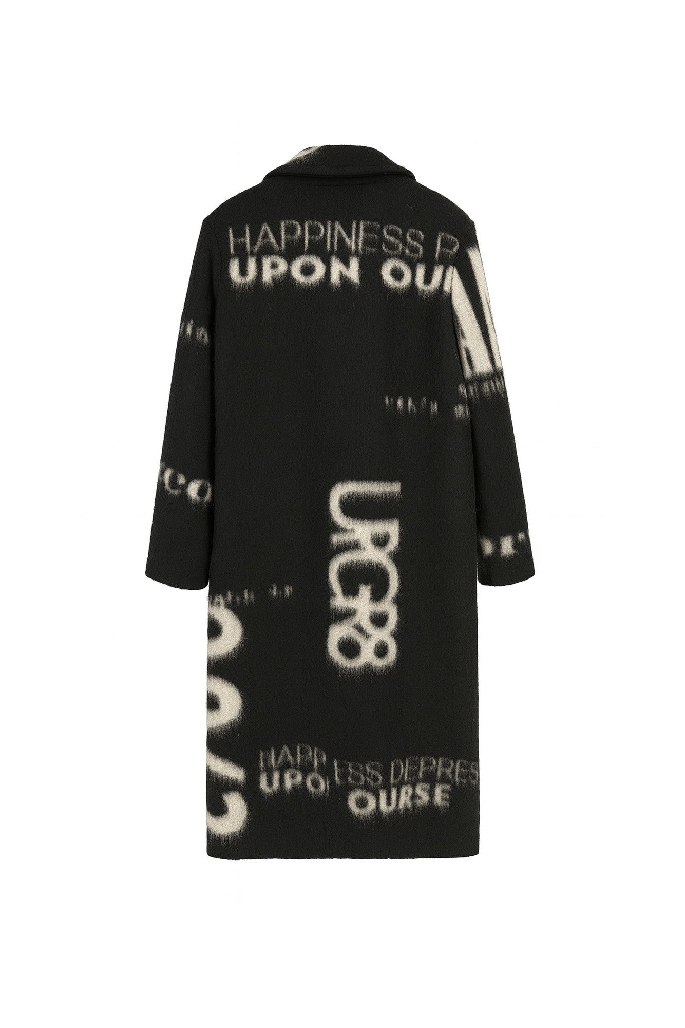 This knee-length coat showcases a striking graffiti-inspired felt pattern in timeless black and white contrast. Both fashionable and warm, it’s perfect for those in-between seasons.