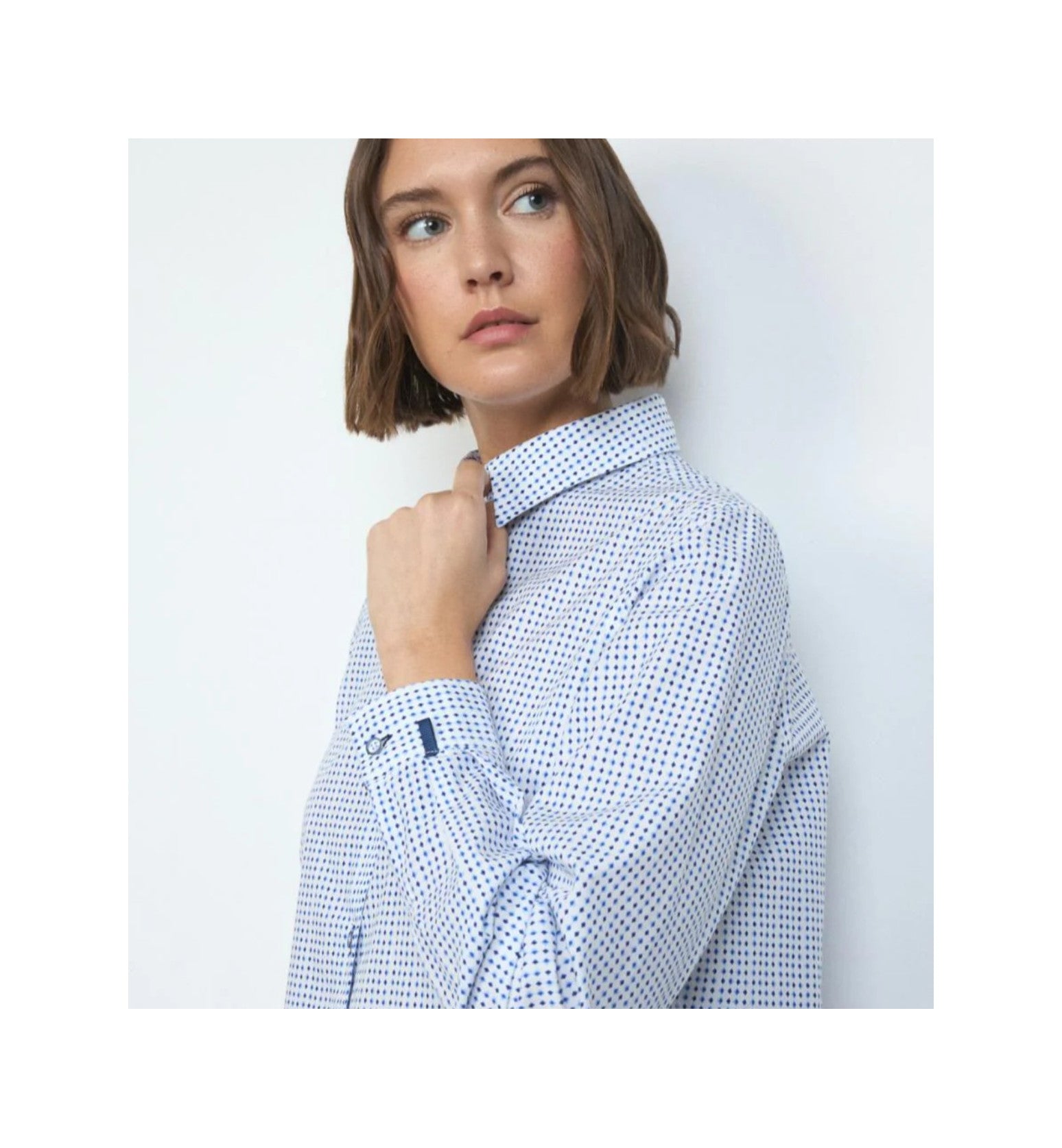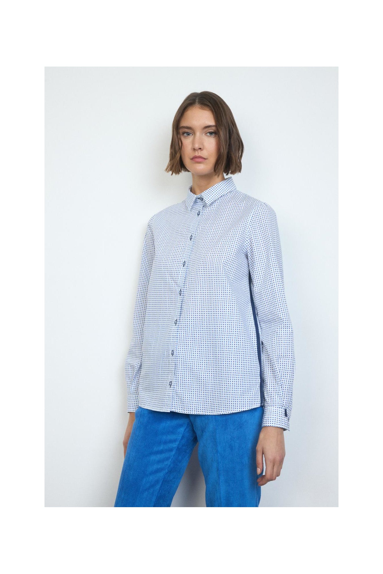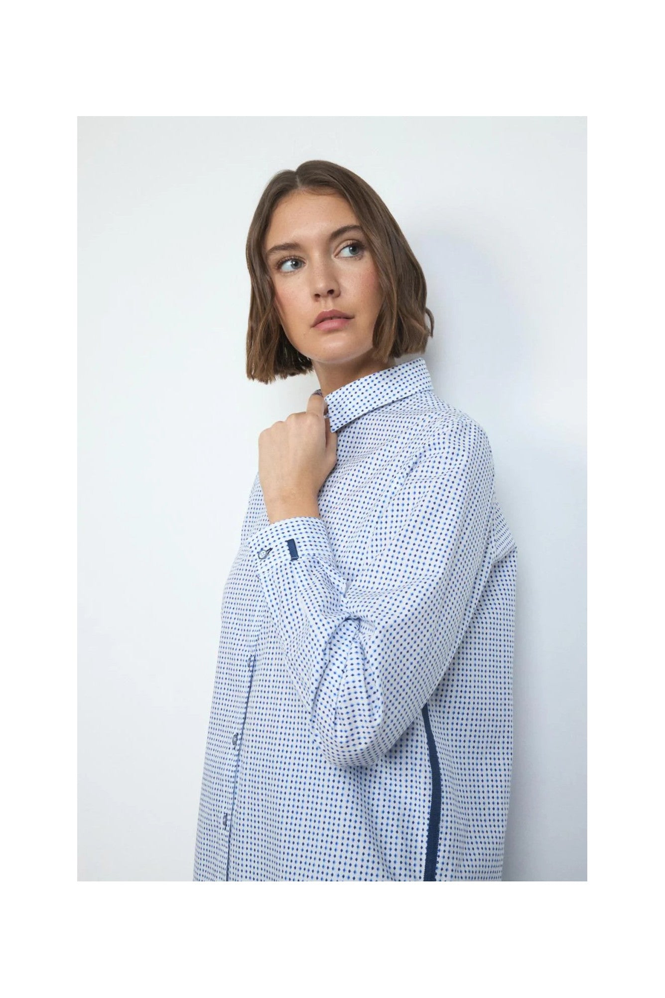 This printed blouse features a classic shirt collar and a coordinating button-down front. It offers a straight-fit design enhanced with contrasting ribbon accents along the sides. The long sleeves are finished with buttoned cuffs, and the hem is gently rounded for a polished look.
