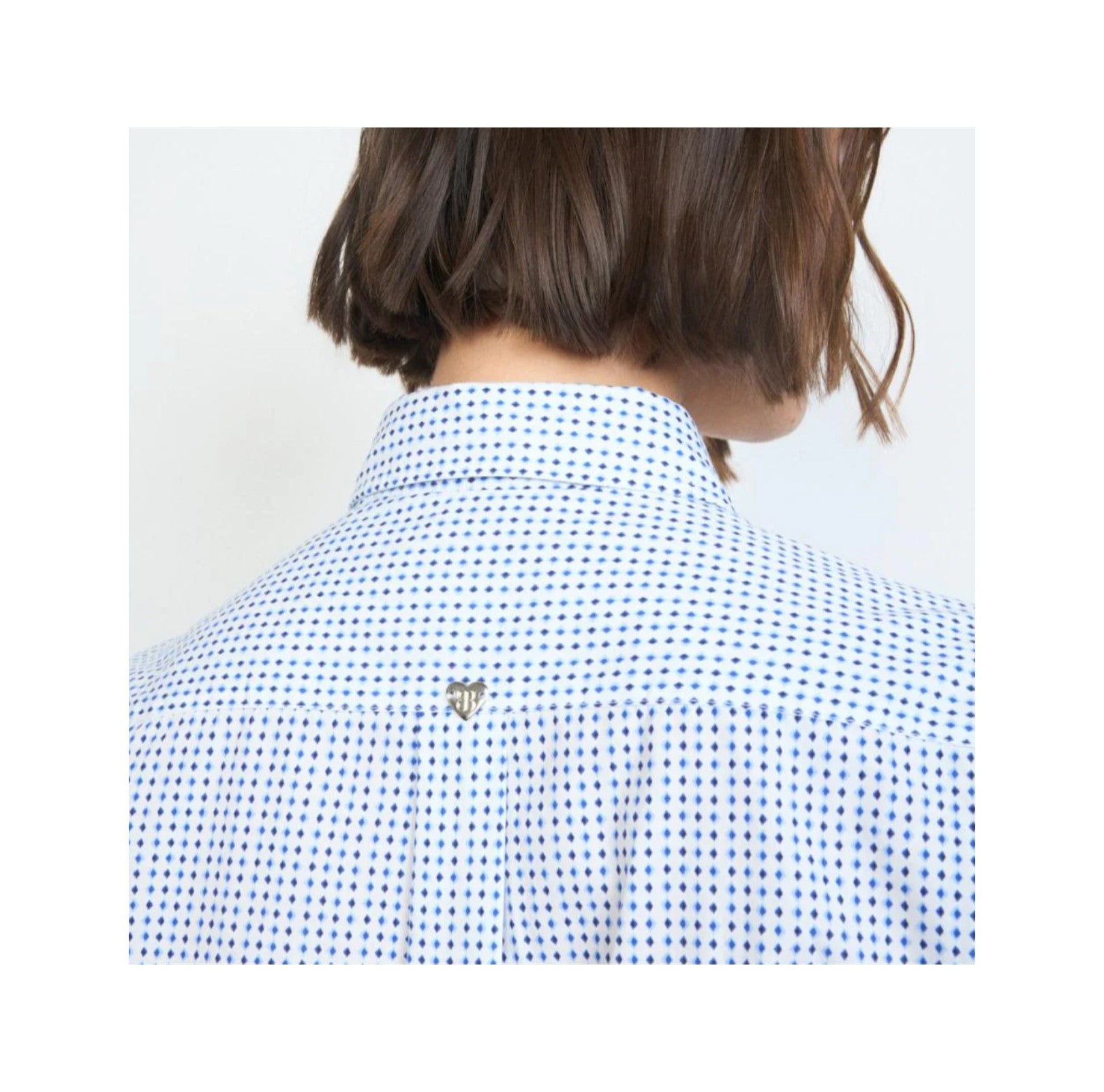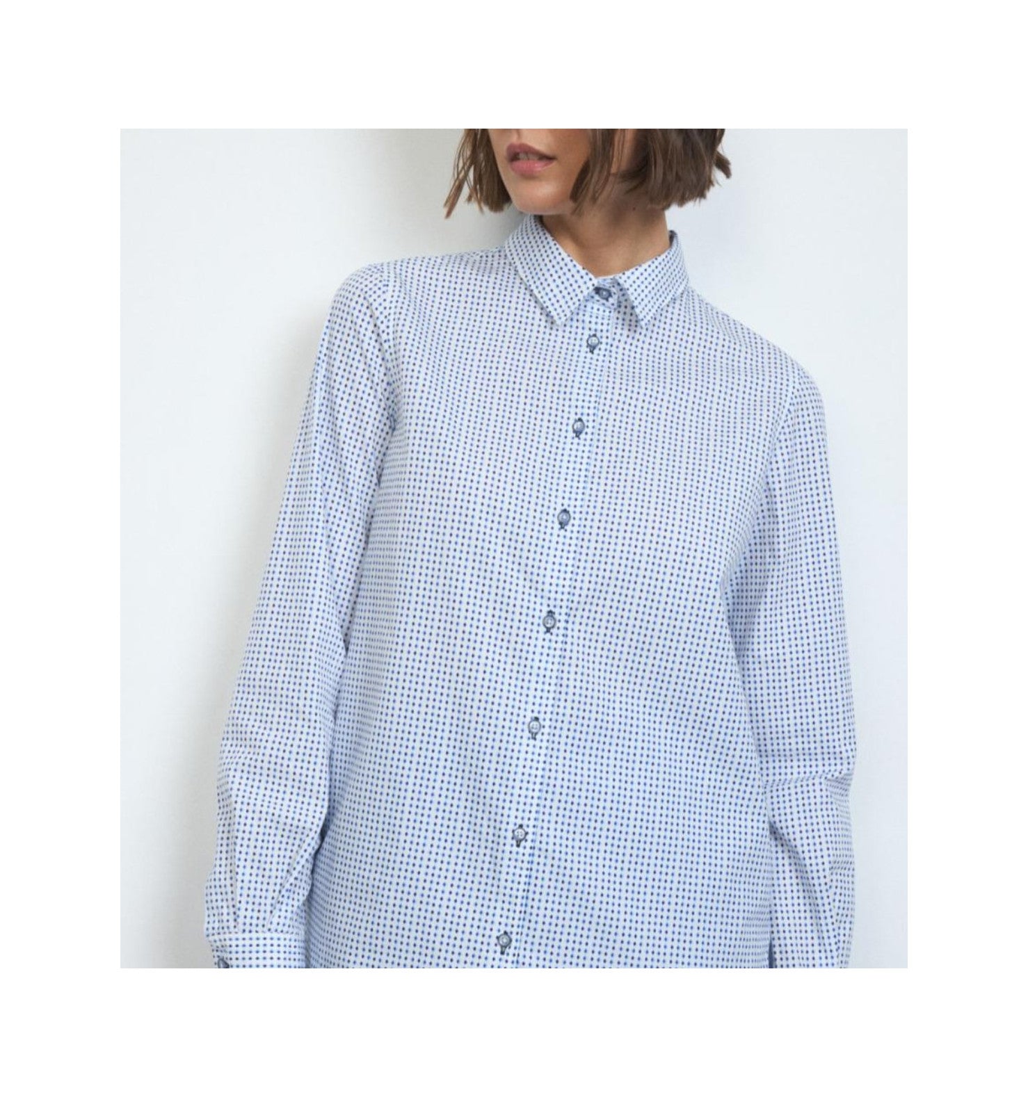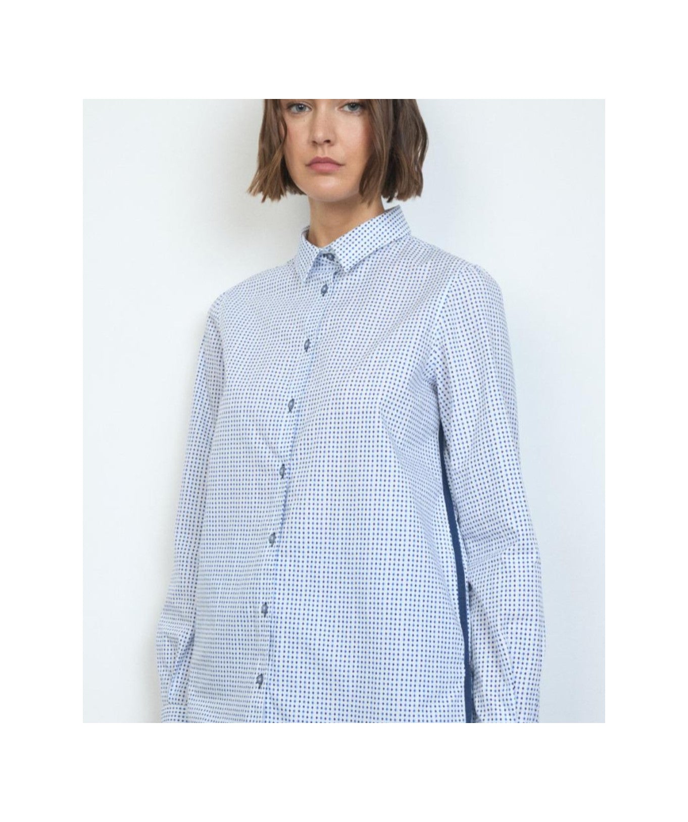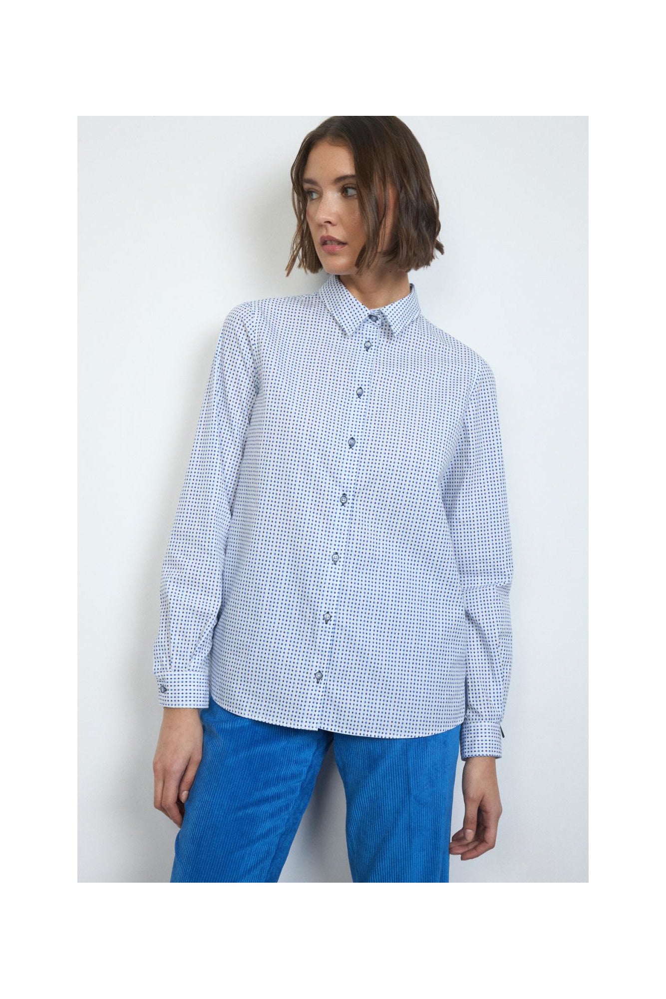This printed blouse features a classic shirt collar and a coordinating button-down front. It offers a straight-fit design enhanced with contrasting ribbon accents along the sides. The long sleeves are finished with buttoned cuffs, and the hem is gently rounded for a polished look.