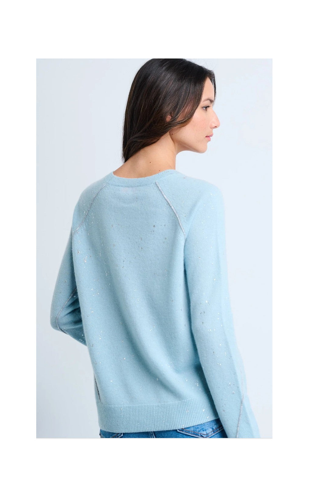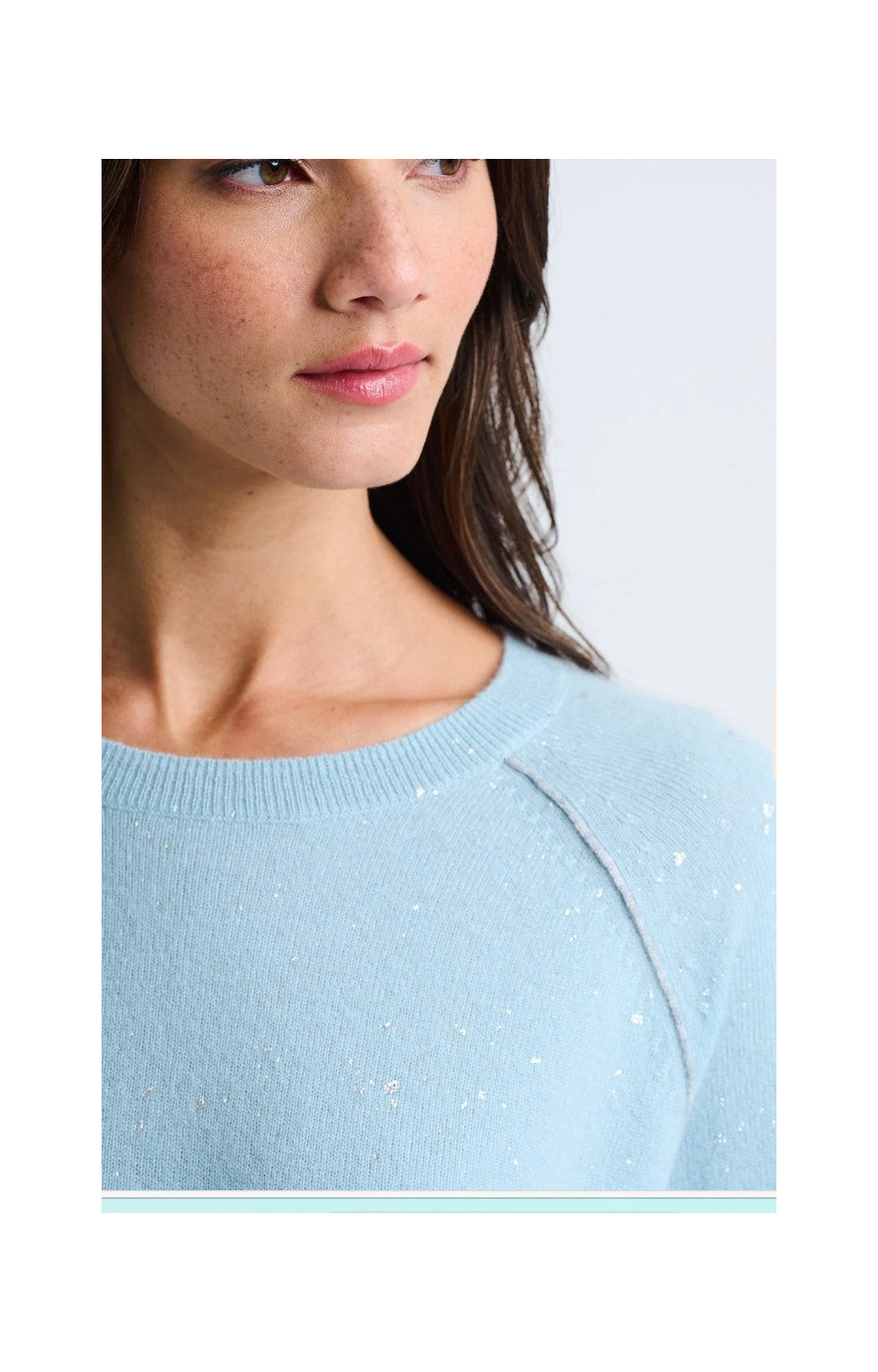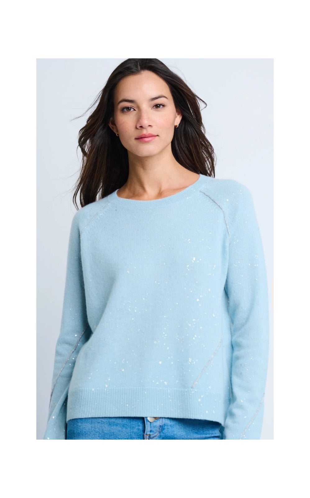 The Diamond Dust pullover cashmere sweater features a gentle shimmer printed throughout, adding a delicate sparkle to this timeless classic. It offers just the right touch of elegance to elevate your wardrobe. Available in two stunning colors—soft blue and mid-tone grey—each includes subtle silver shimmer details. The sweater is designed with contrasting tonal seams along the shoulders and angled around the arms for a refined finish.
