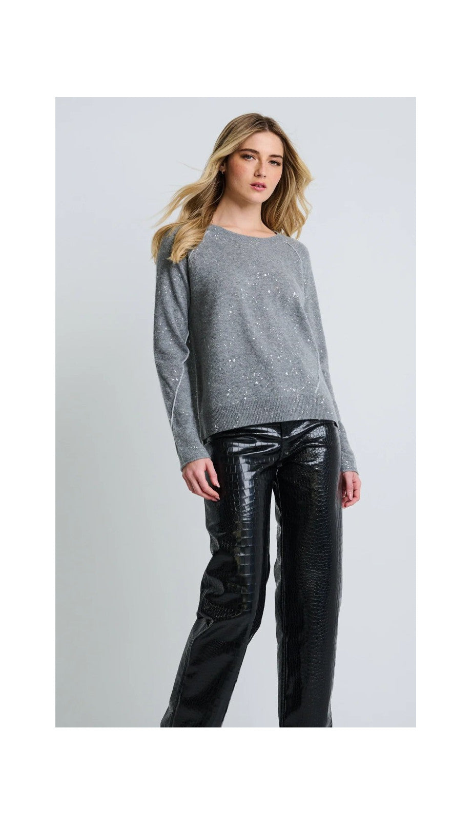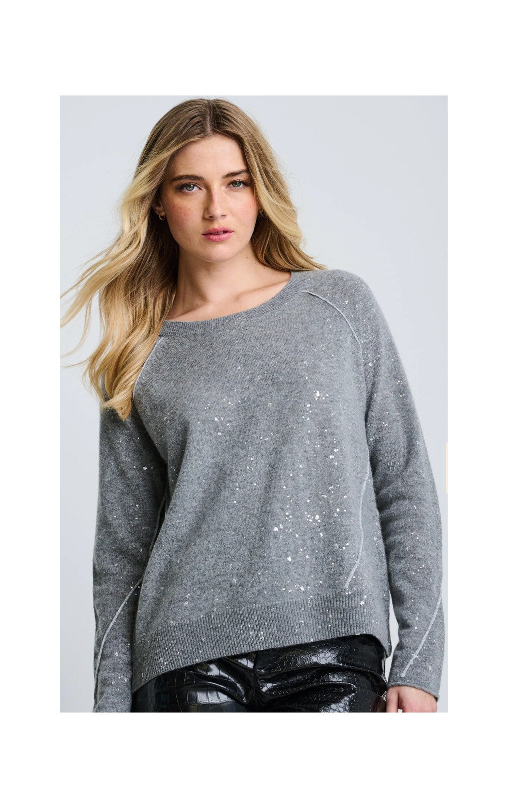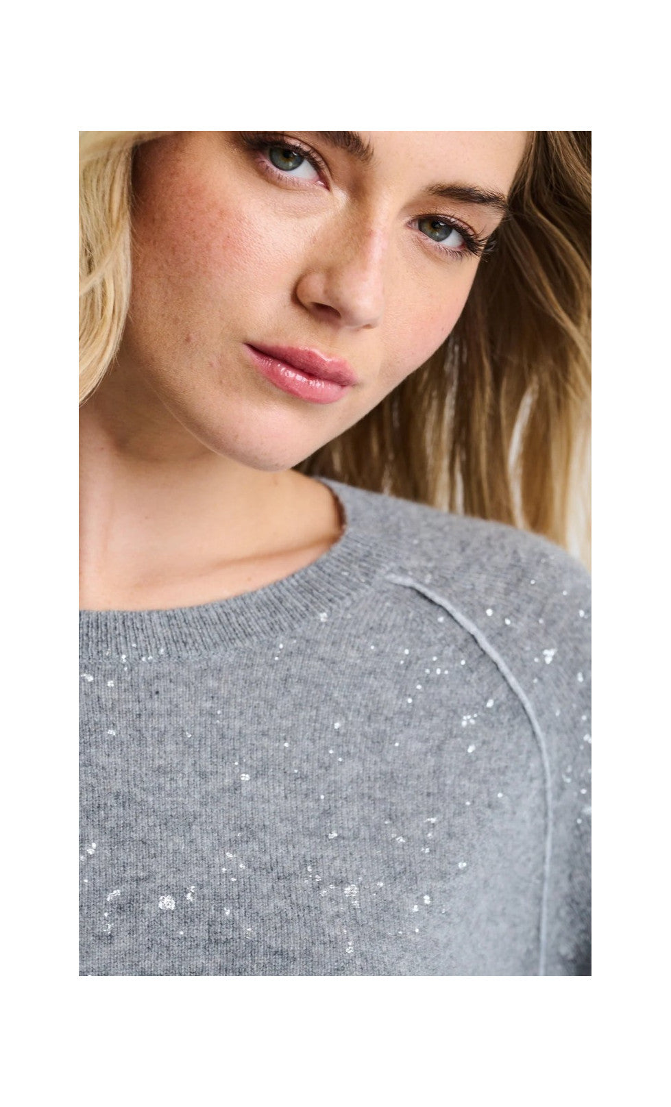 The Diamond Dust pullover cashmere sweater features a gentle shimmer printed throughout, adding a delicate sparkle to this timeless classic. It offers just the right touch of elegance to elevate your wardrobe. Available in two stunning colors—soft blue and mid-tone grey—each includes subtle silver shimmer details. The sweater is designed with contrasting tonal seams along the shoulders and angled around the arms for a refined finish.
