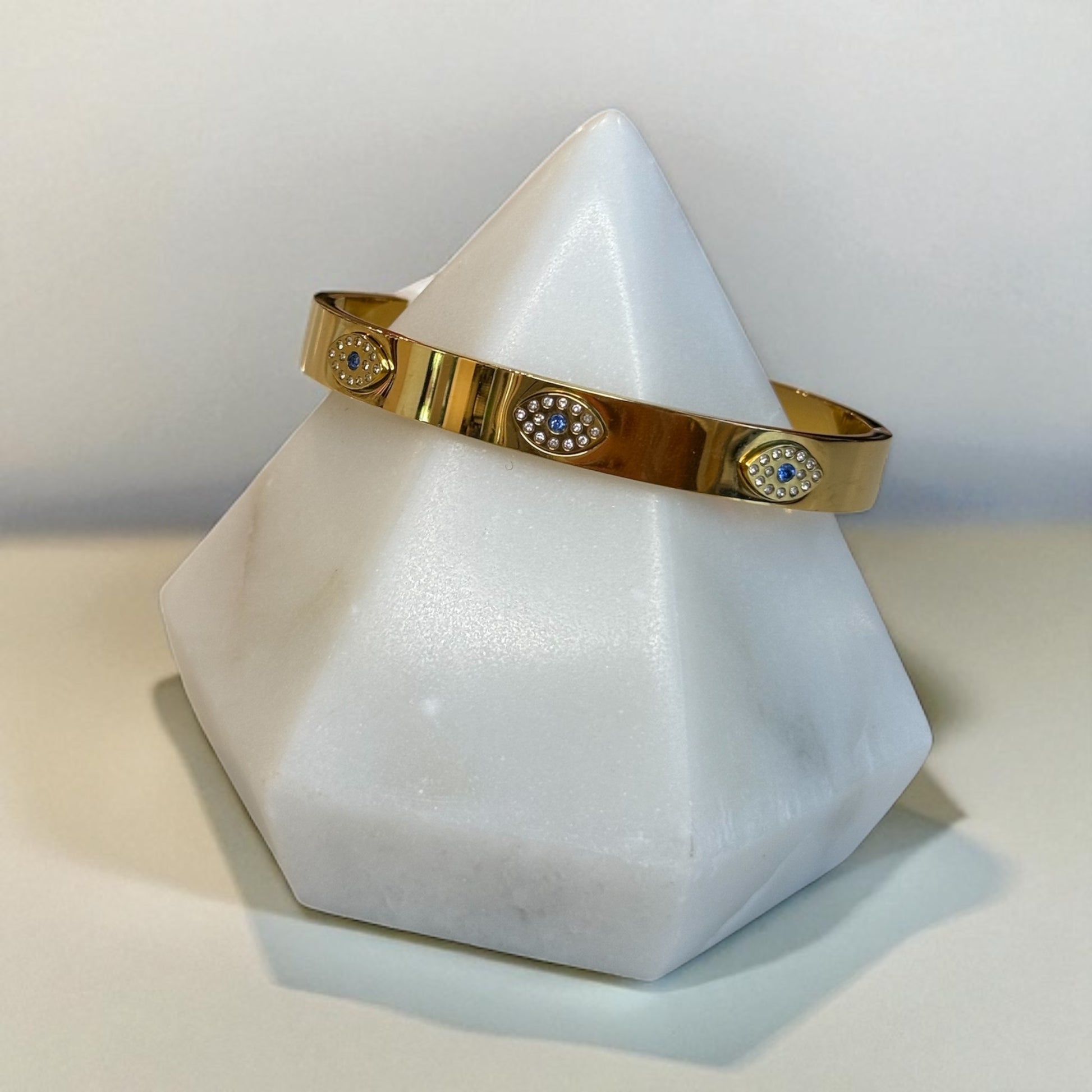 This playful evil eye hinge bangle is stylish and perfect for layering. It adds a trendy touch to any outfit.