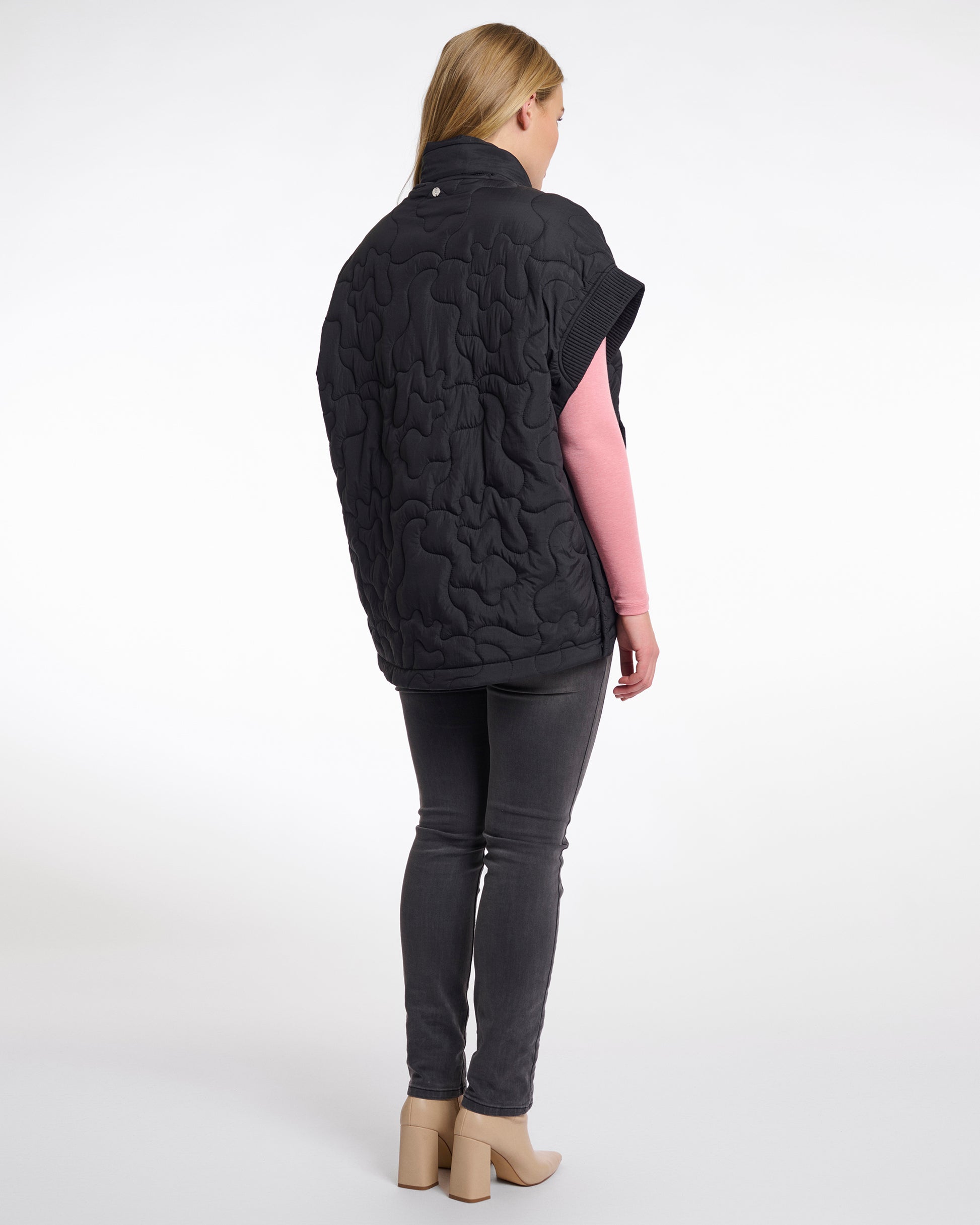This softly quilted extend sleeve vest is ideal for layering over a chunky knit sweater or a light jacket this season. It features a gentle scroll pattern, knit trim on the sleeves, spacious side slash pockets, and a slightly longer hemline at the back for added coverage.