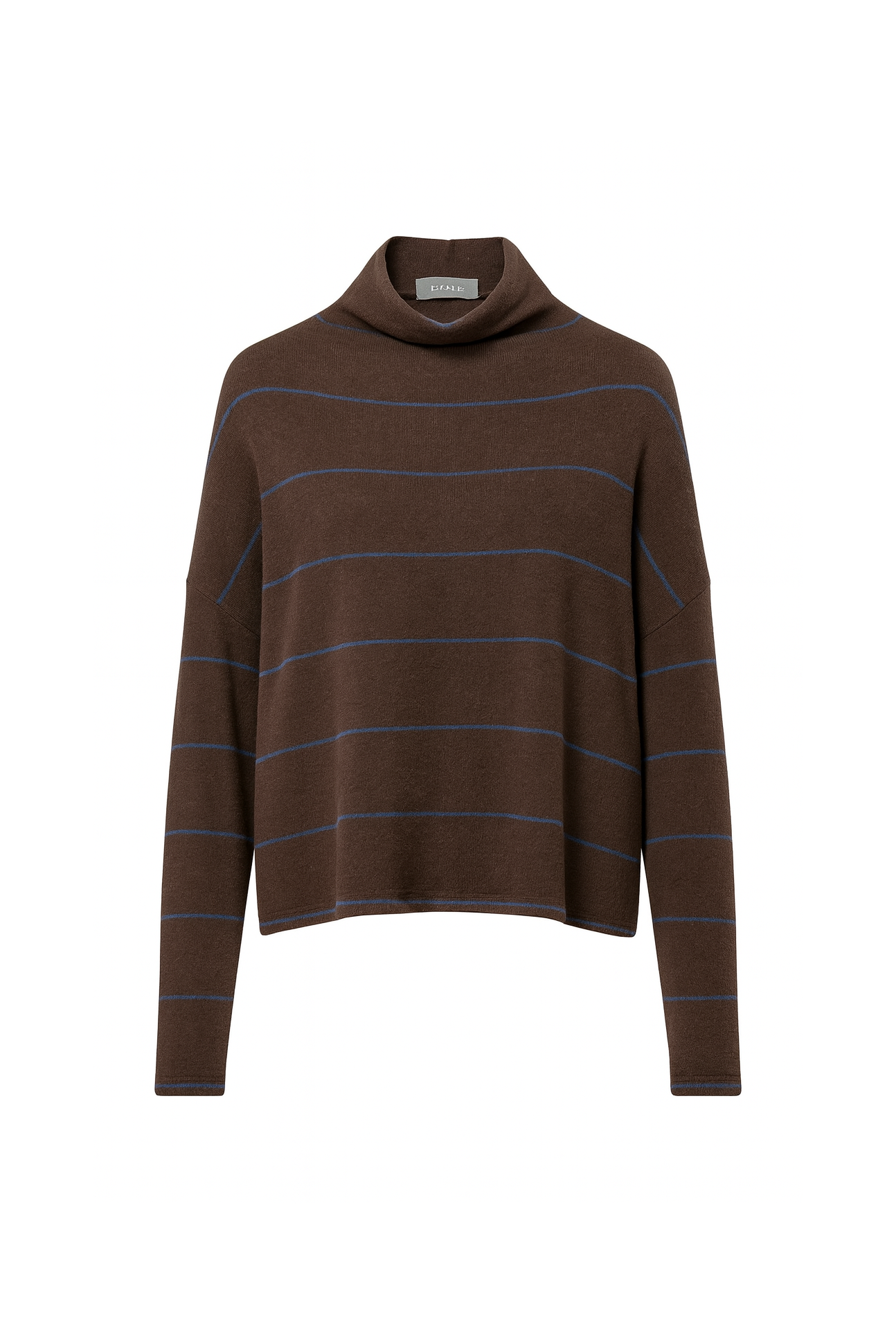 This soft mockneck features delicate light blue thin stripes on a heather brown, lightweight knit fabric. Its drapey fit is flattering and ideal for a polished Fall look.