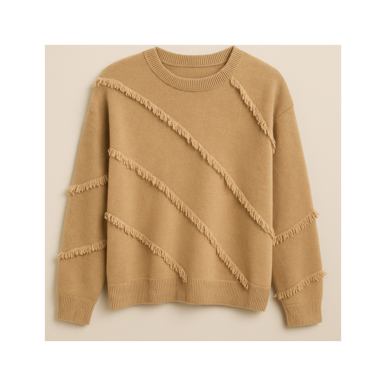 This sweater features diagonal fringe detailing and is crafted from ultra-soft yarn. Its playful design adds a unique touch, making it a great new piece for your fall collection.