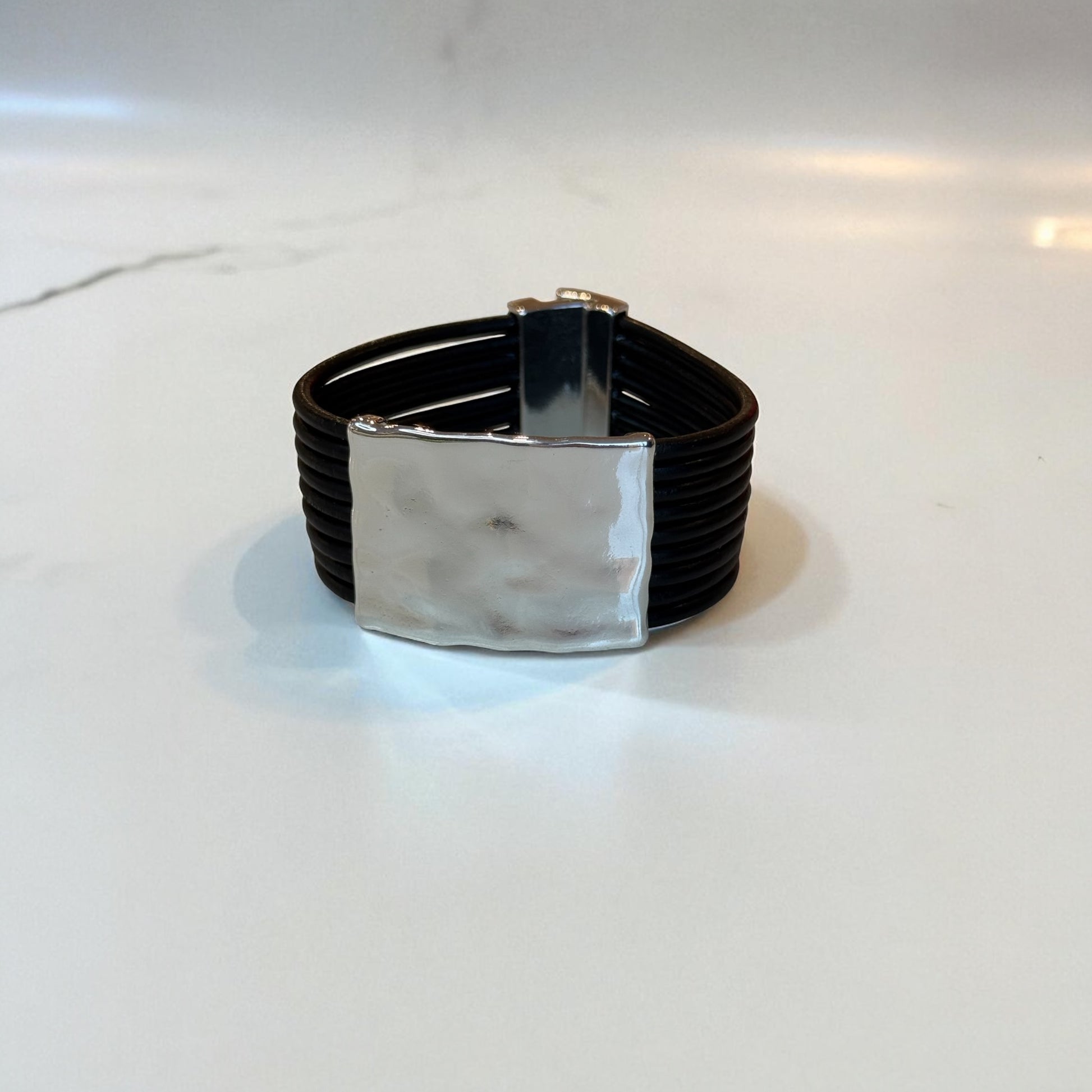 This bracelet features hammered metal accents combined with black multi-cord strands and a magnetic clasp for secure and convenient fastening.