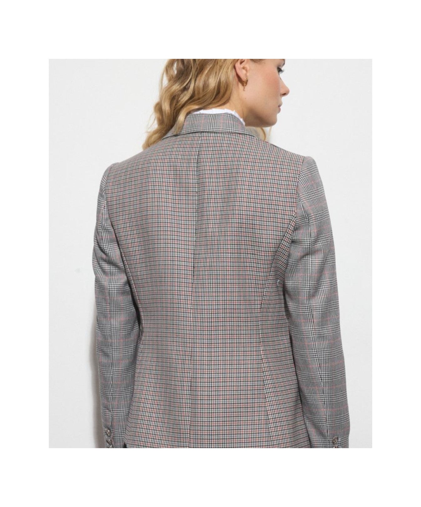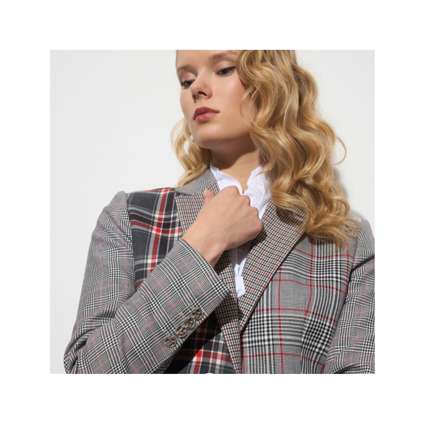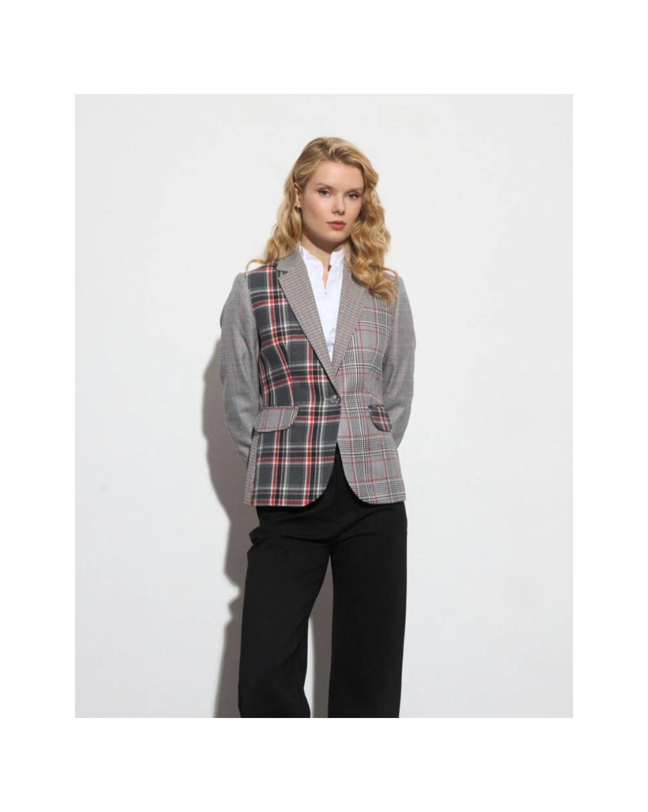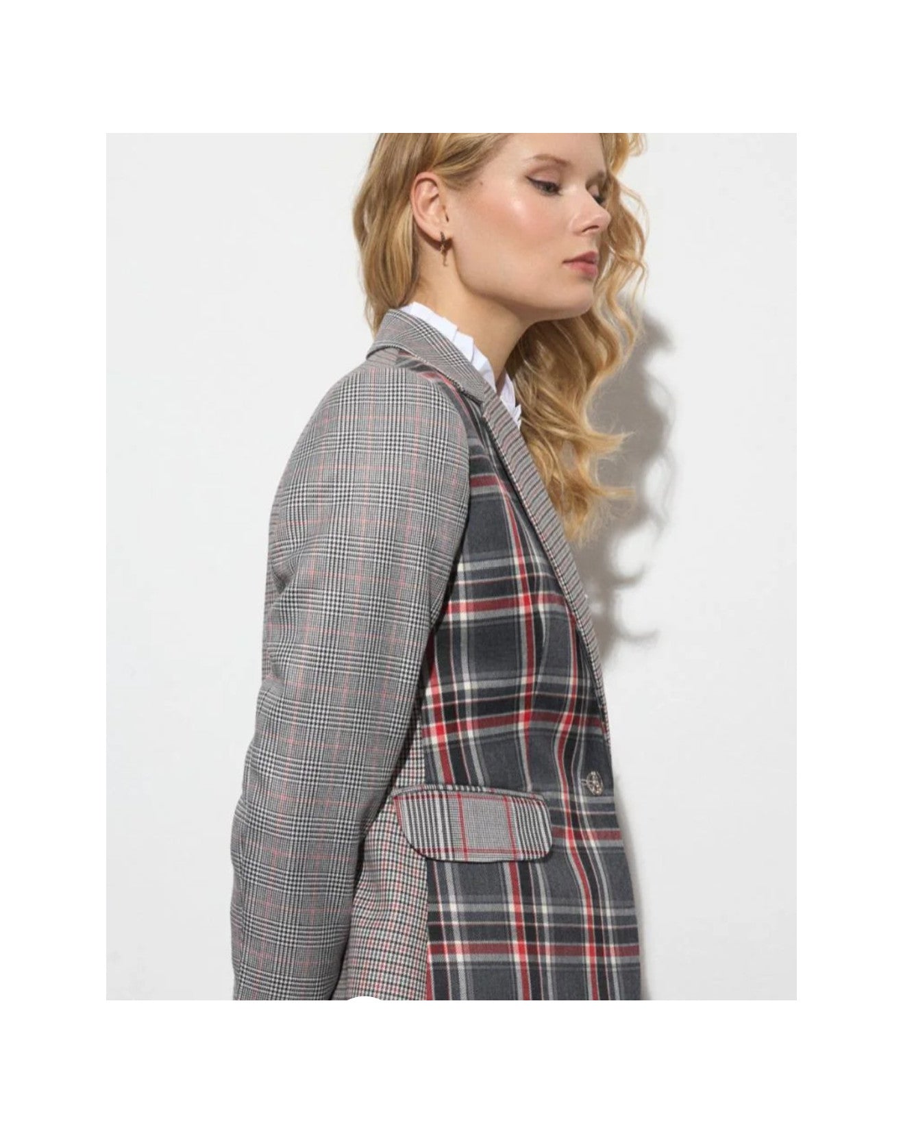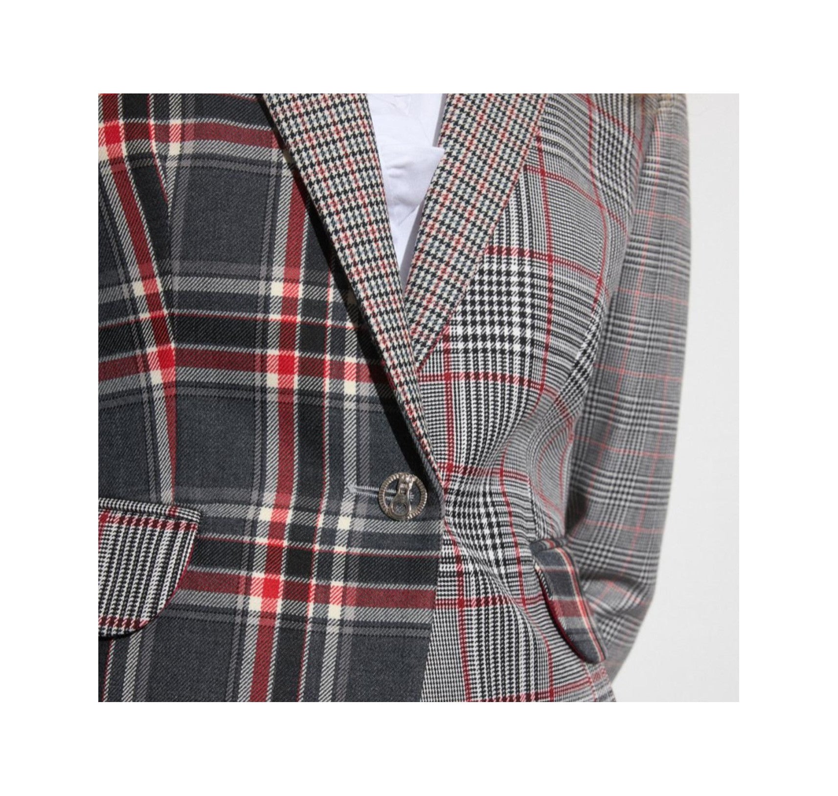 This checkered blazer features a notched lapel collar and a double-breasted front with jewel buttons. It has long sleeves accented by decorative button plackets and front flap pockets. The blend of two contrasting plaids adds a distinctive touch to this timeless piece.