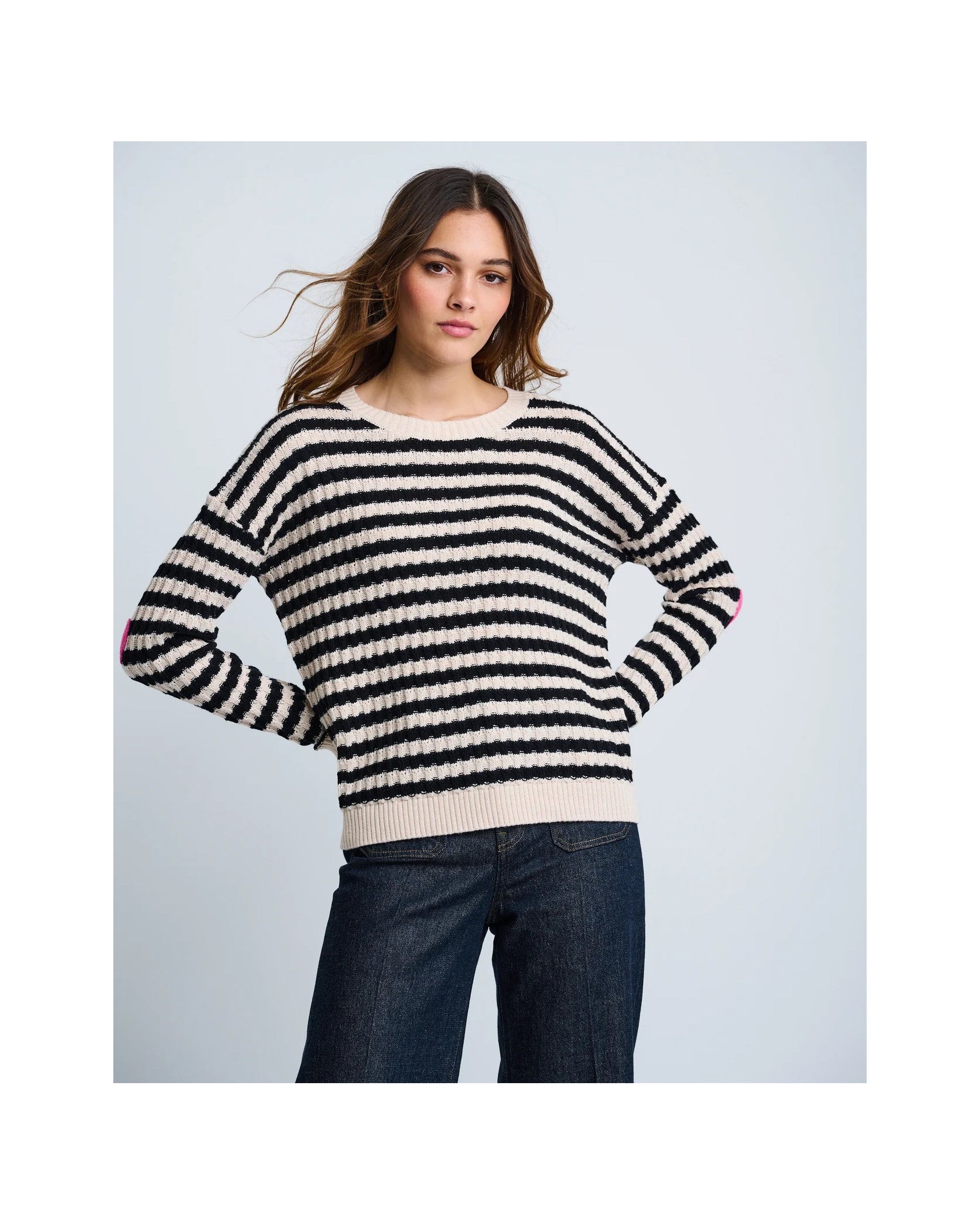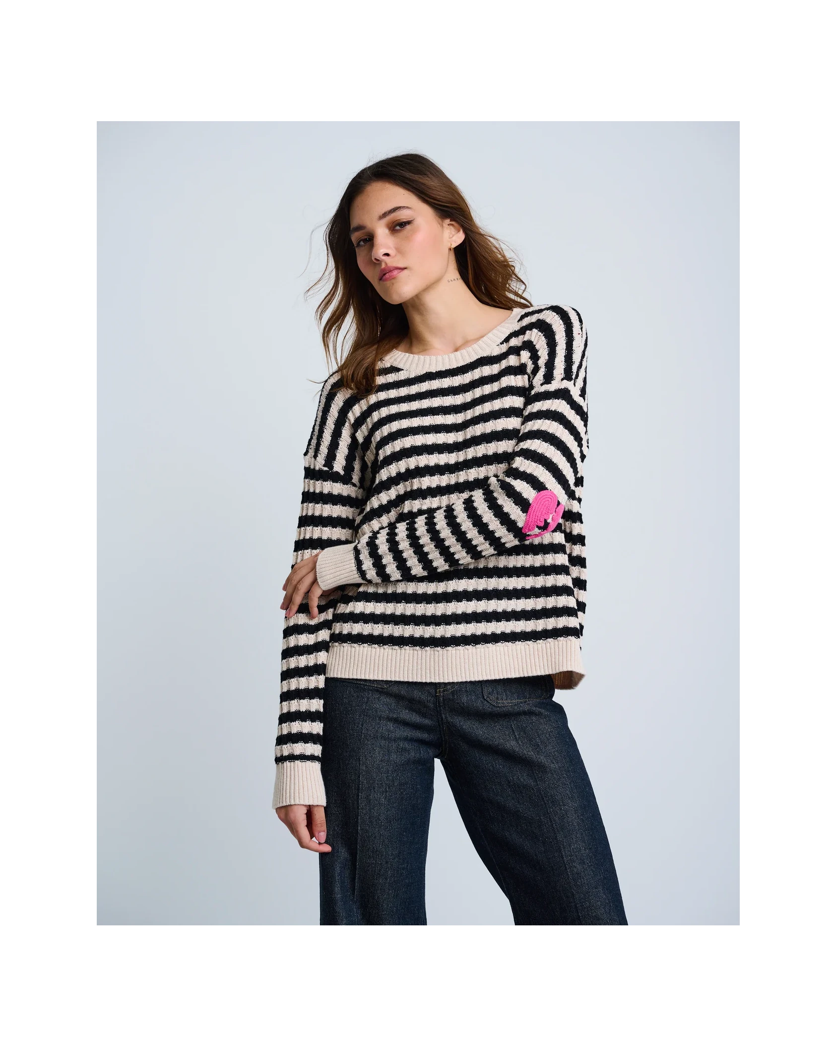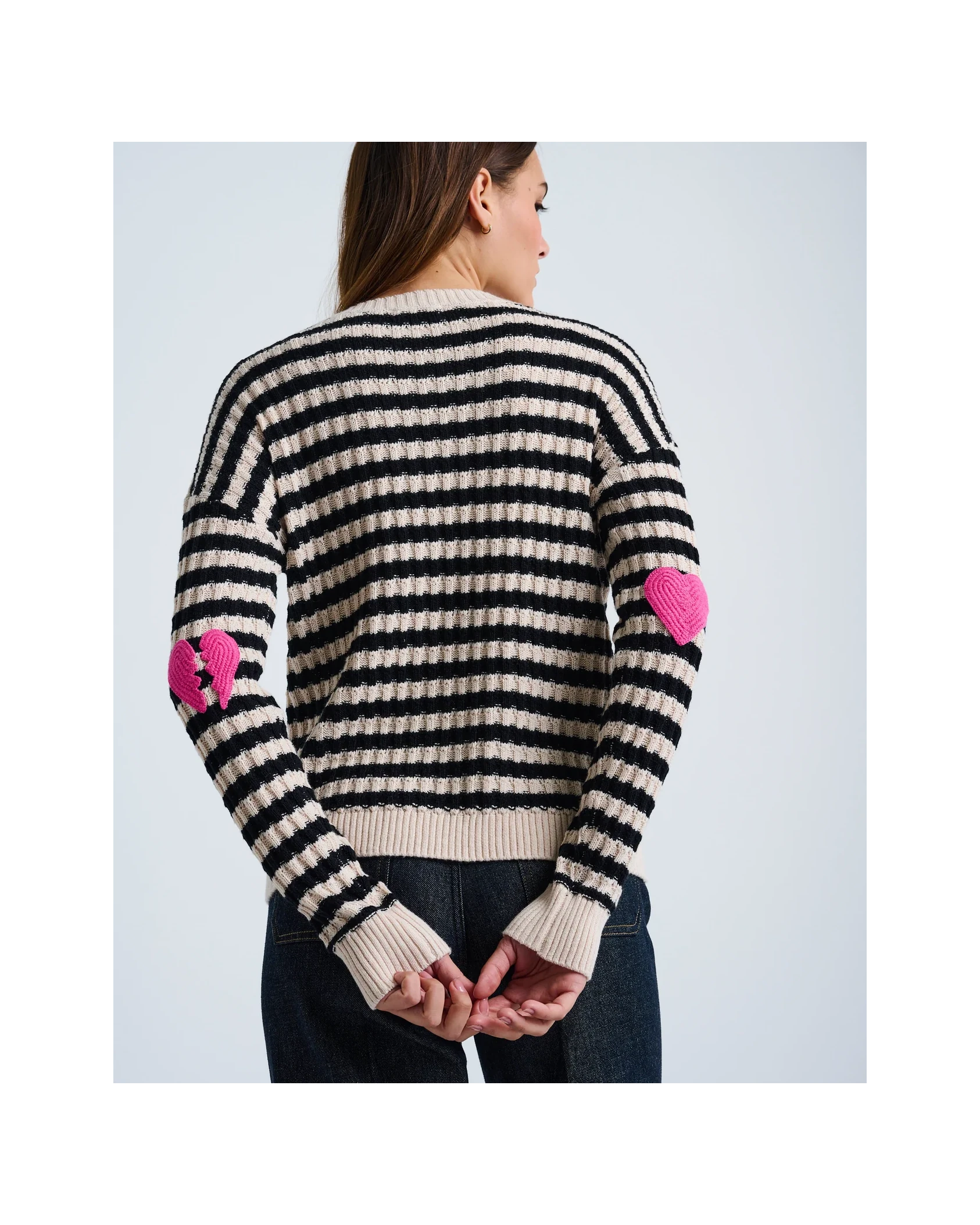 This playful black and ivory striped sweater features bright pink heart patches on the elbows for a cheerful touch. With a classic crewneck design, it’s a fresh and unique way to introduce stripes into your seasonal wardrobe—with a delightful twist!