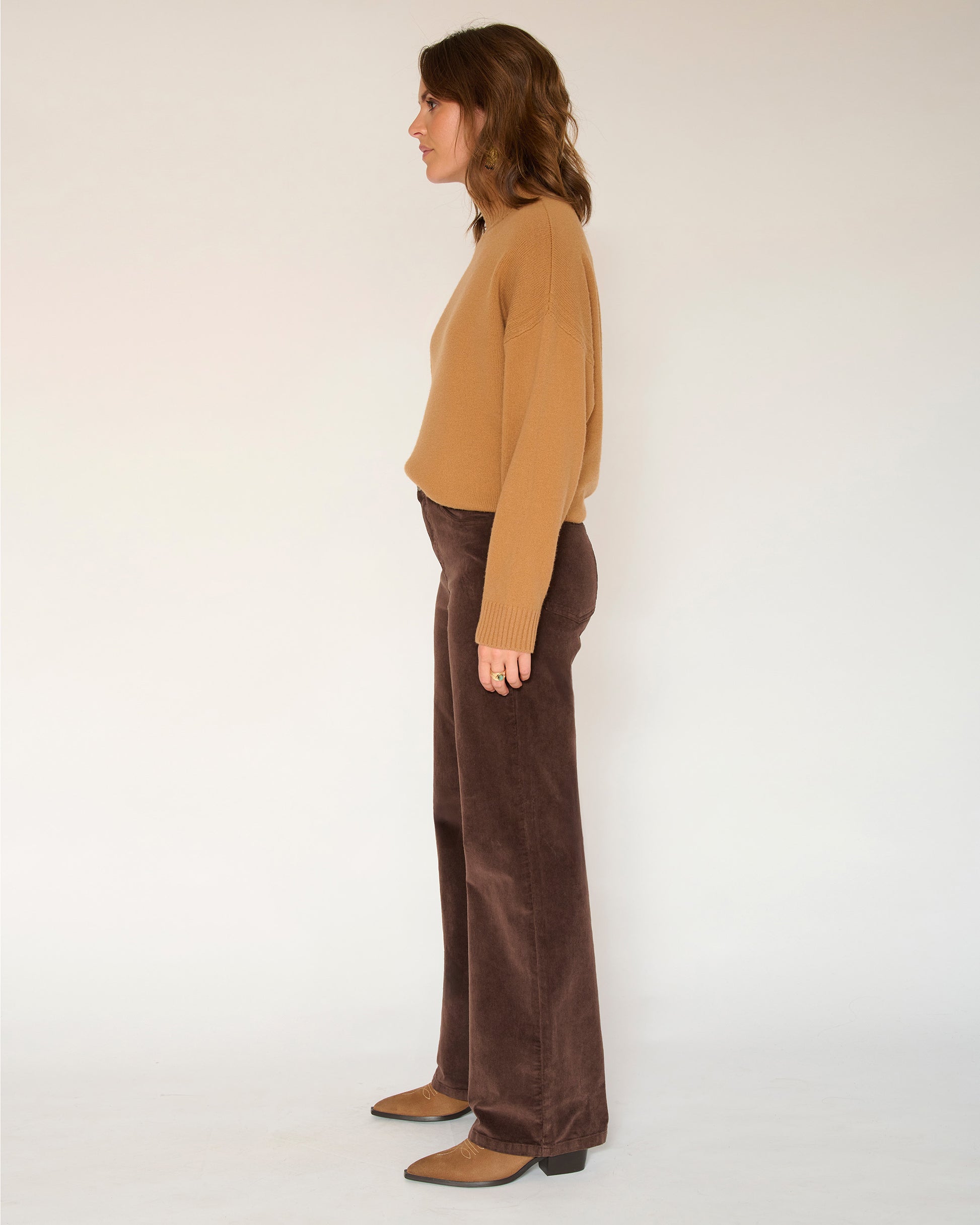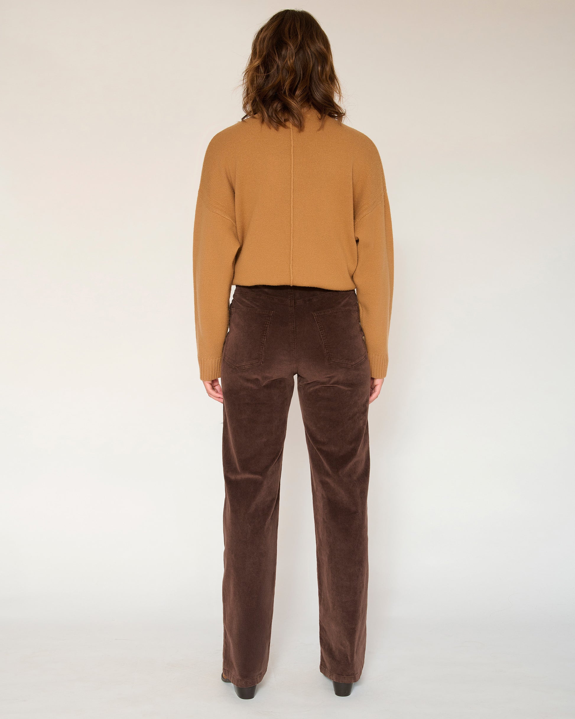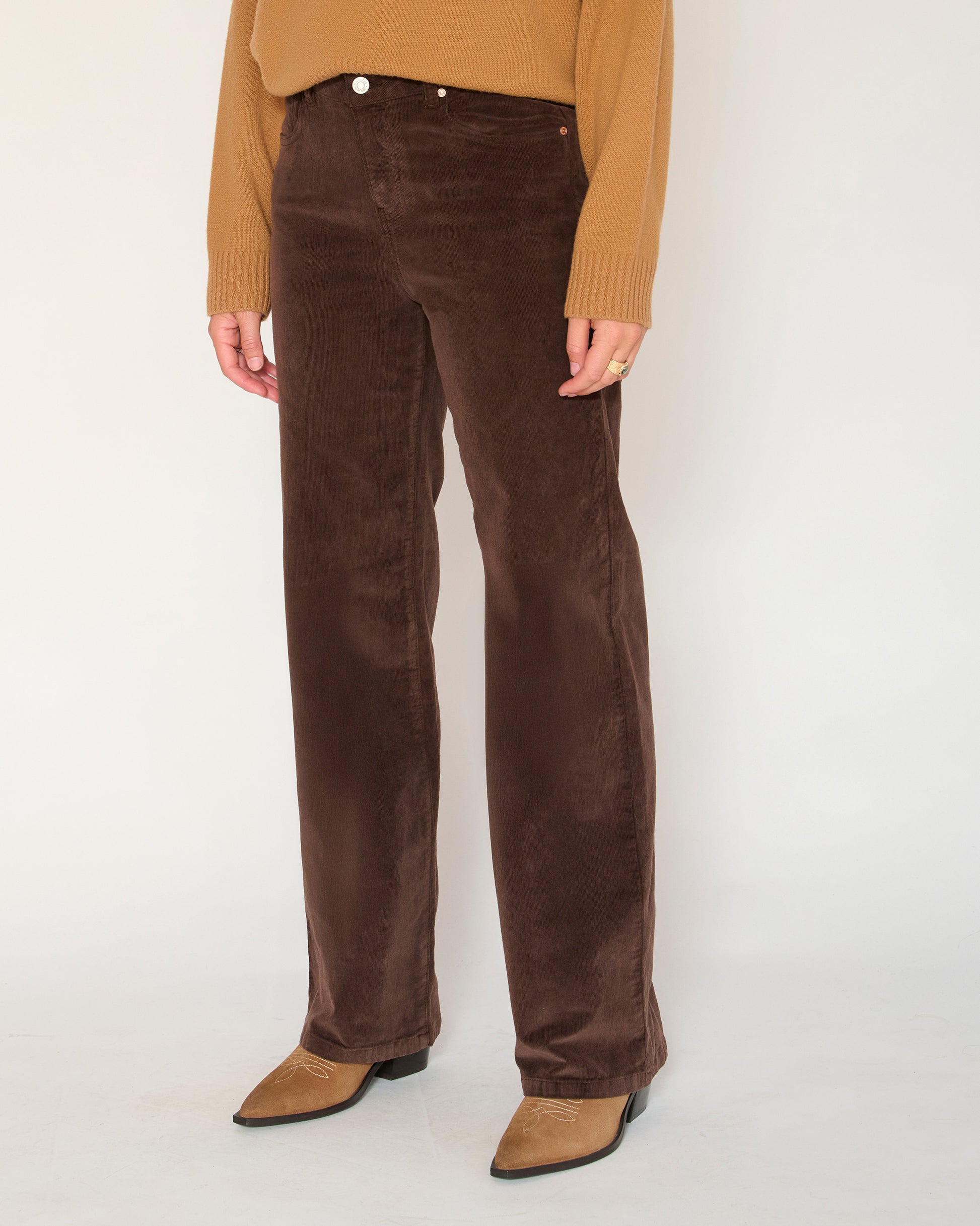 These cord pants come in a deep chocolate brown with a fine wale texture. Featuring a softly flared wide leg and classic riveted five-pocket design, they are an essential addition to your wardrobe this season.