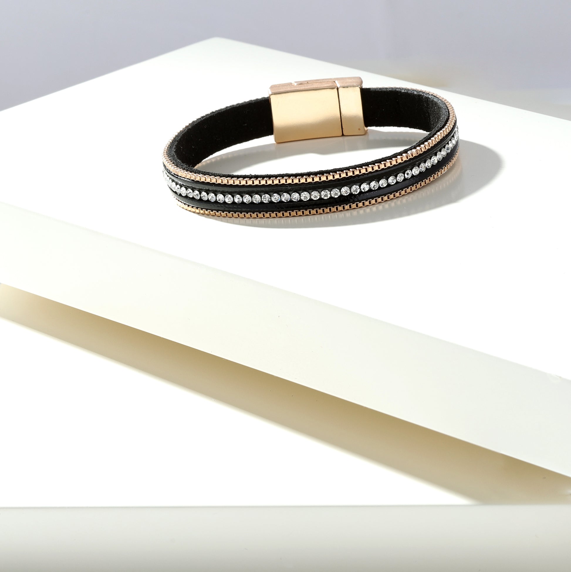A crystal center stud surrounded by a box link chain forms an ideal bracelet for layering. It features a magnetic clasp for easy wear.