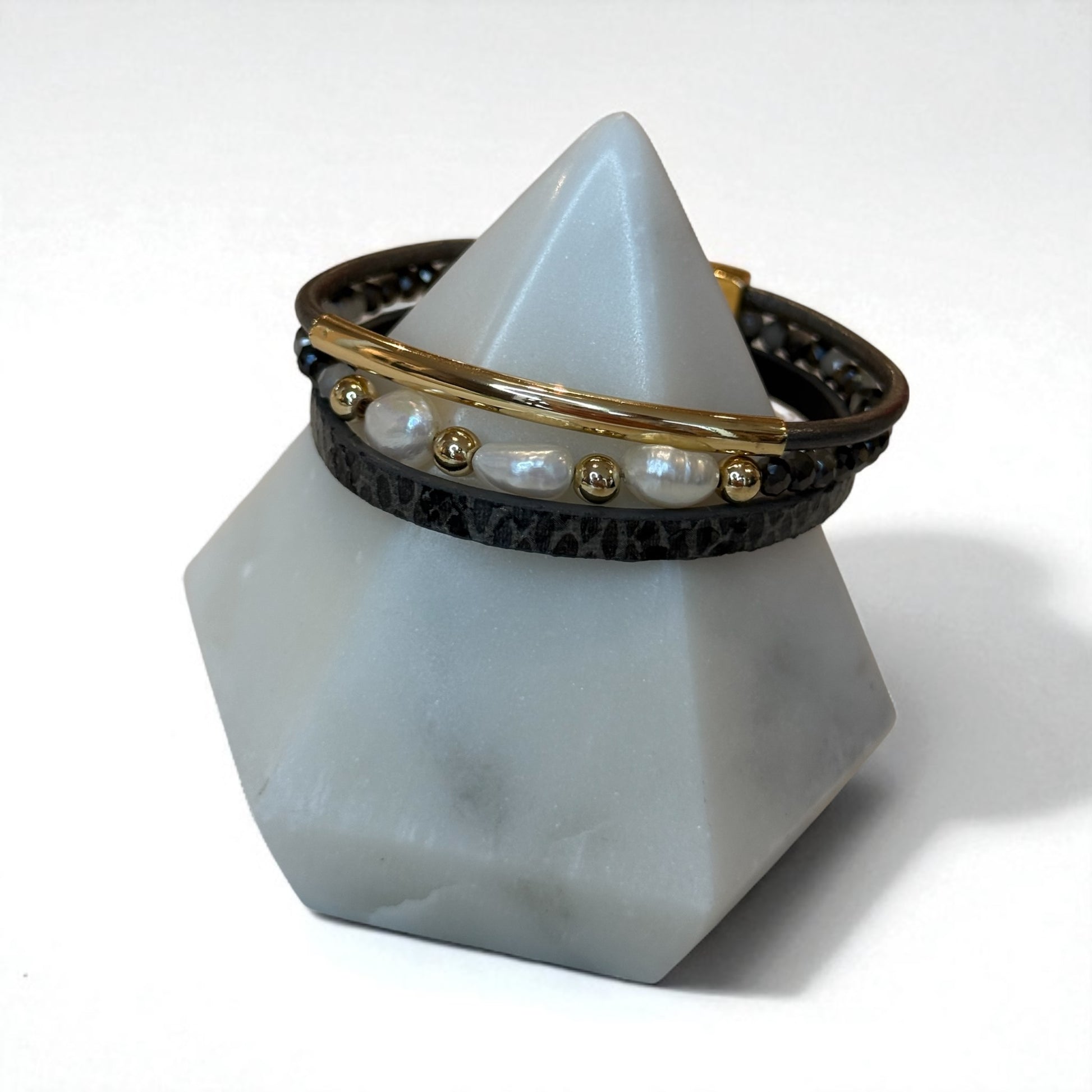This bracelet features a blend of pearl-like beads paired with grey and black cords, secured with a magnetic clasp for easy wear.