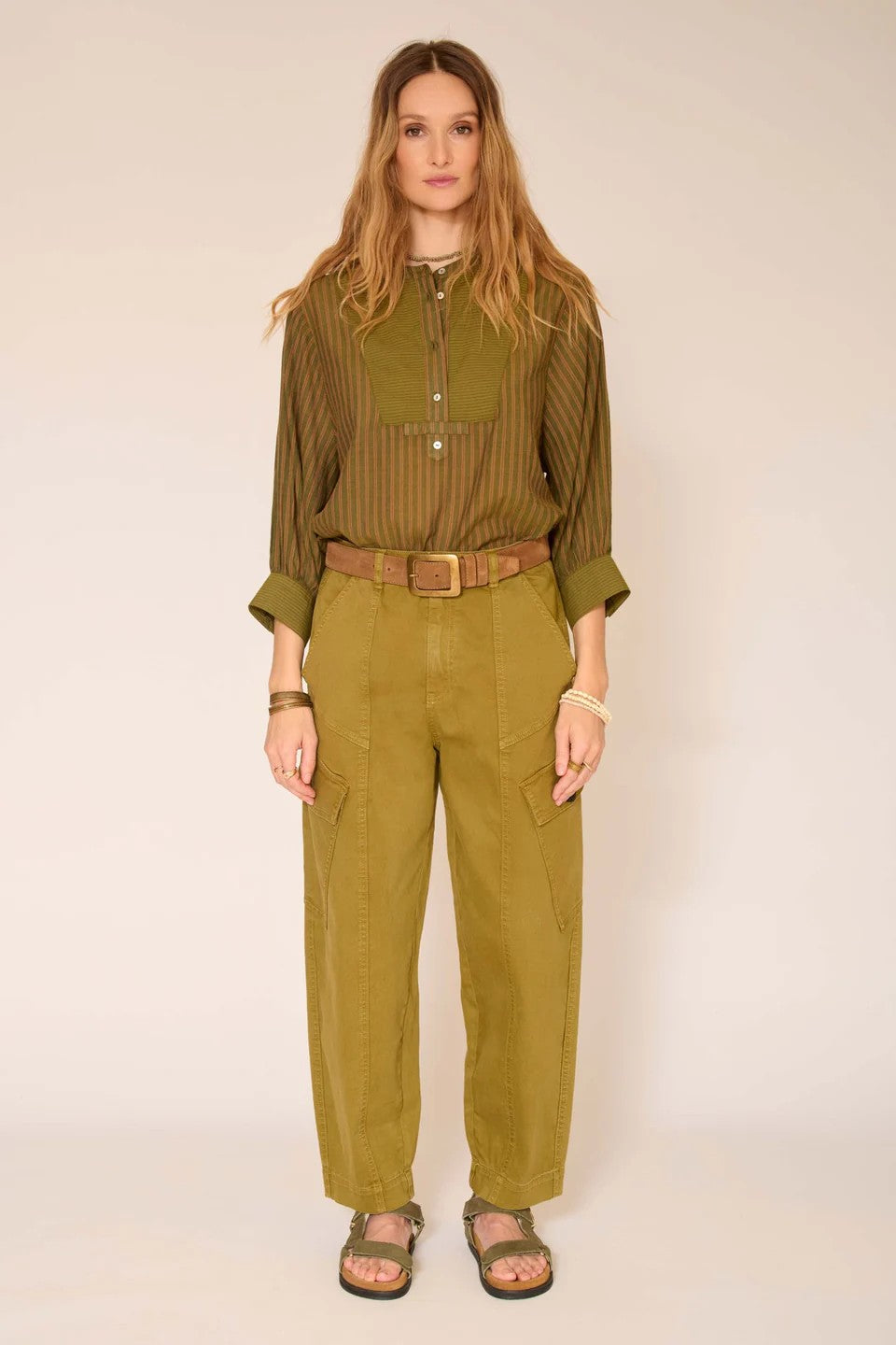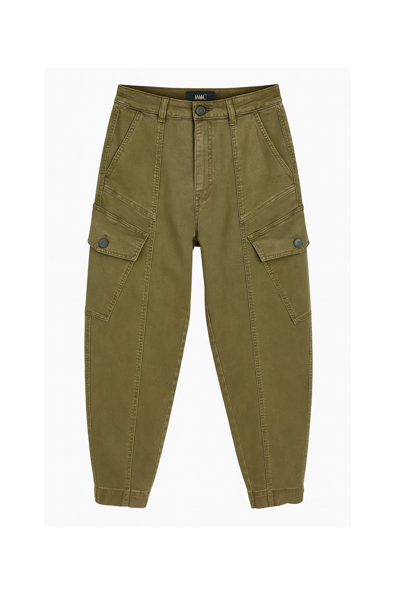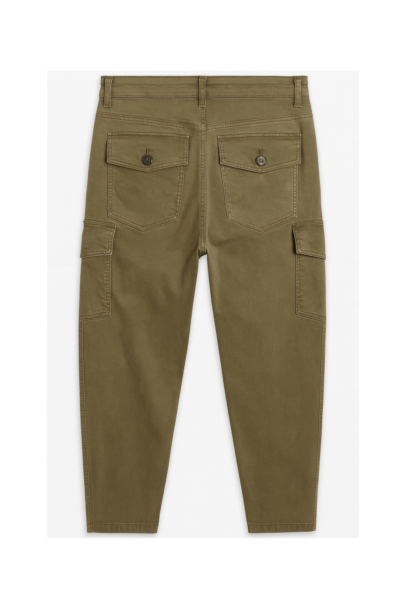 This updated twill cargo pant in olive green features a subtly washed fabric for a relaxed look. A slanted cargo pocket partially across the thigh creates a slimming silhouette, complemented by deep front pockets for practicality. Made with a silky, stretchy cotton blended fabric, it offers both comfort and style. The 26" inseam makes it ideal for pairing with shoes or booties, while the versatile 14" leg opening enhances wearability. The photo shows an accurate color tone off the body.
