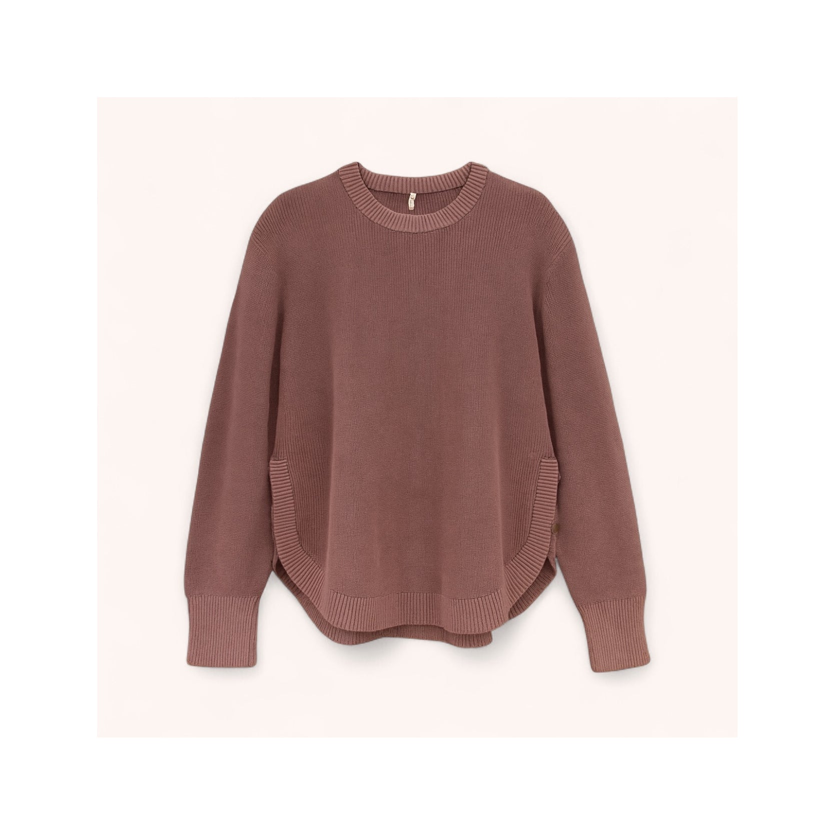 This pullover features a gentle ribbed crewneck paired with a rounded hem and side seam button accents. It includes a 2" ribbed hem and wide ribbed cuffs. Crafted in soft washed shades of dusty aqua and dusty mauve, it’s perfect for a cozy, effortless look with your favorite jeans.