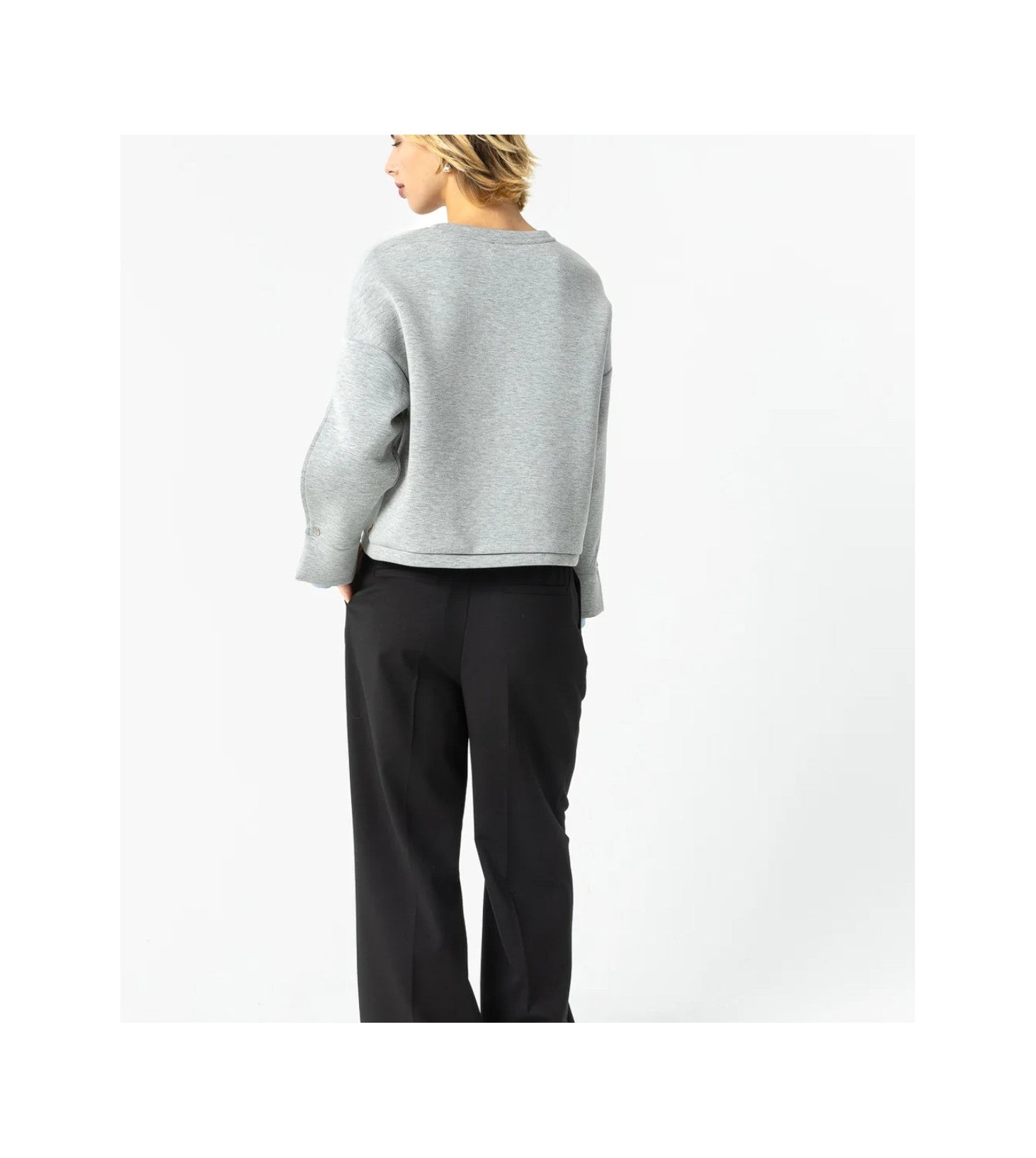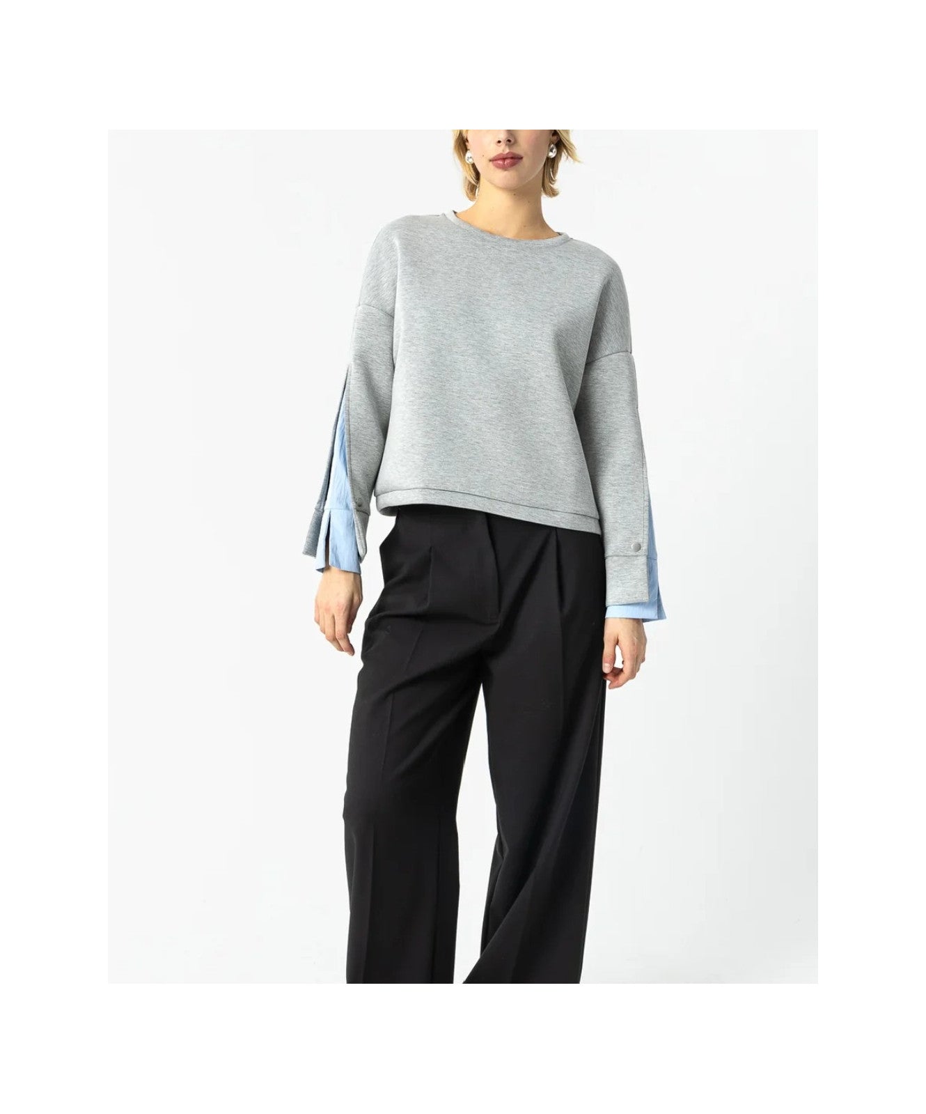 This sweatshirt offers a fresh take on a timeless style. It combines a poly-viscose blend body with a woven blouse insert on the sleeve and features double cuffs. A versatile piece designed for various looks and comfortable wear.