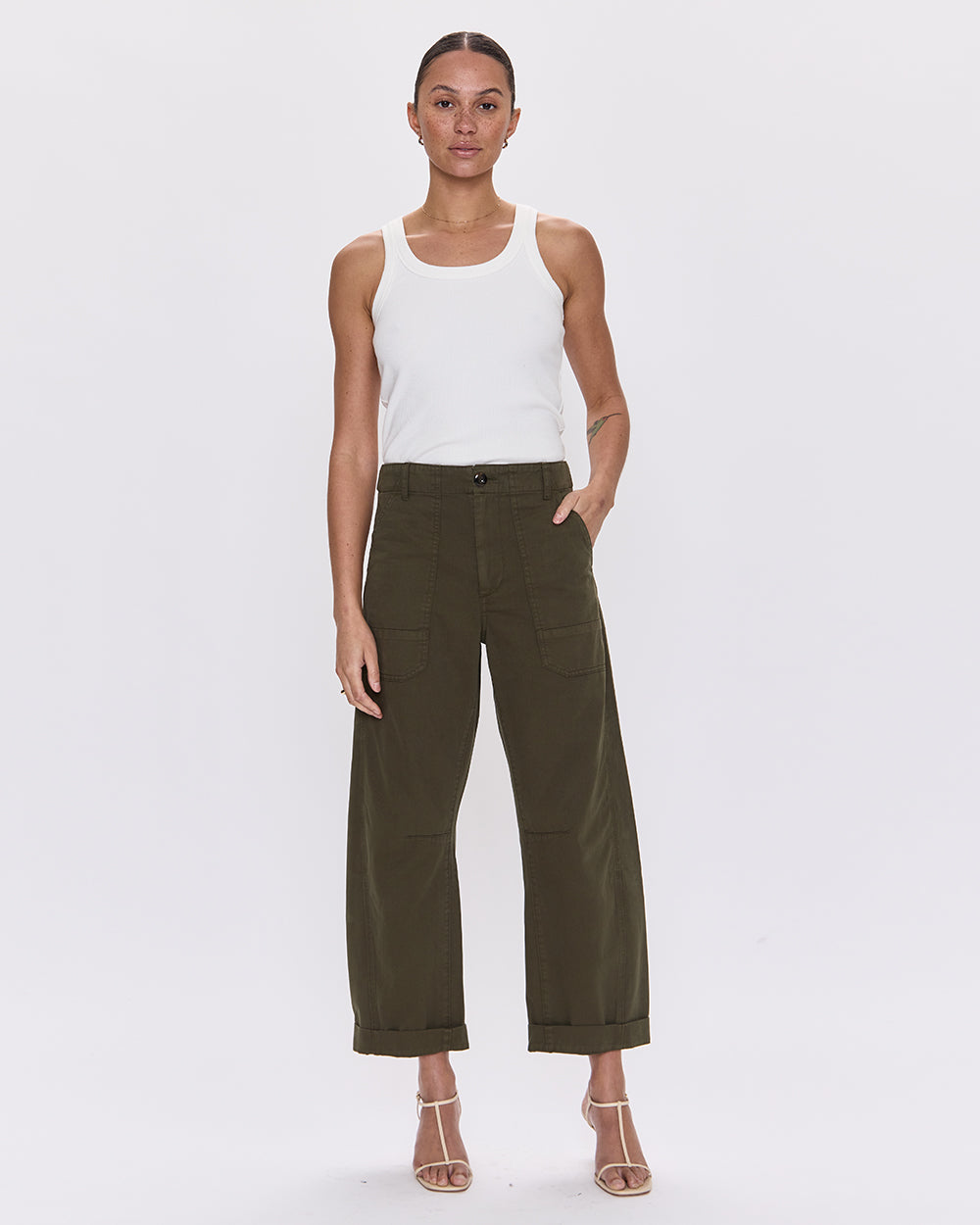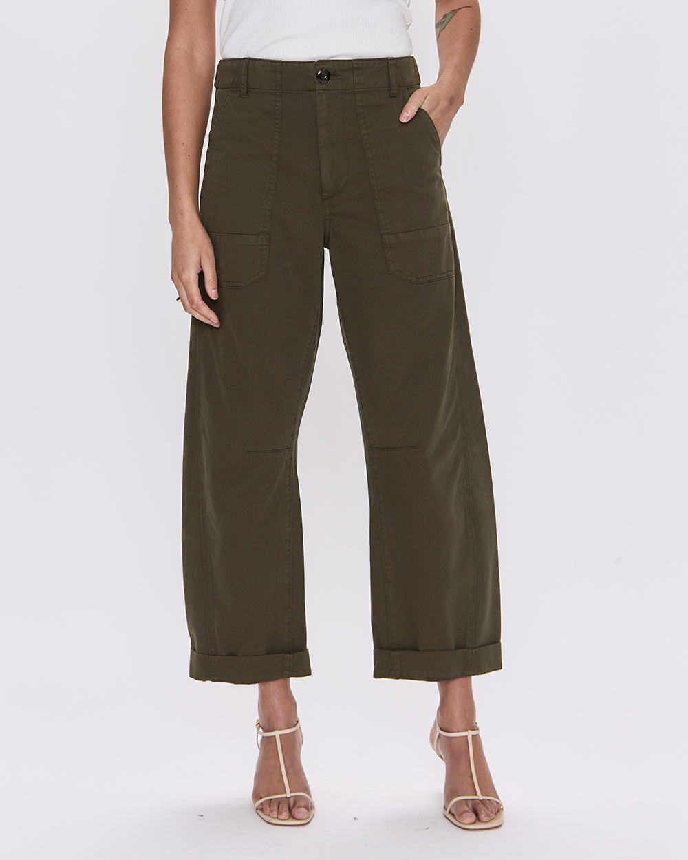 The Sequoia Tori utility pant features a 7/8 length with a relaxed wider leg and stitched back turn-up cuffs. It includes spacious front patch pockets and is crafted from super soft brushed cotton in this season’s ideal olive shade.