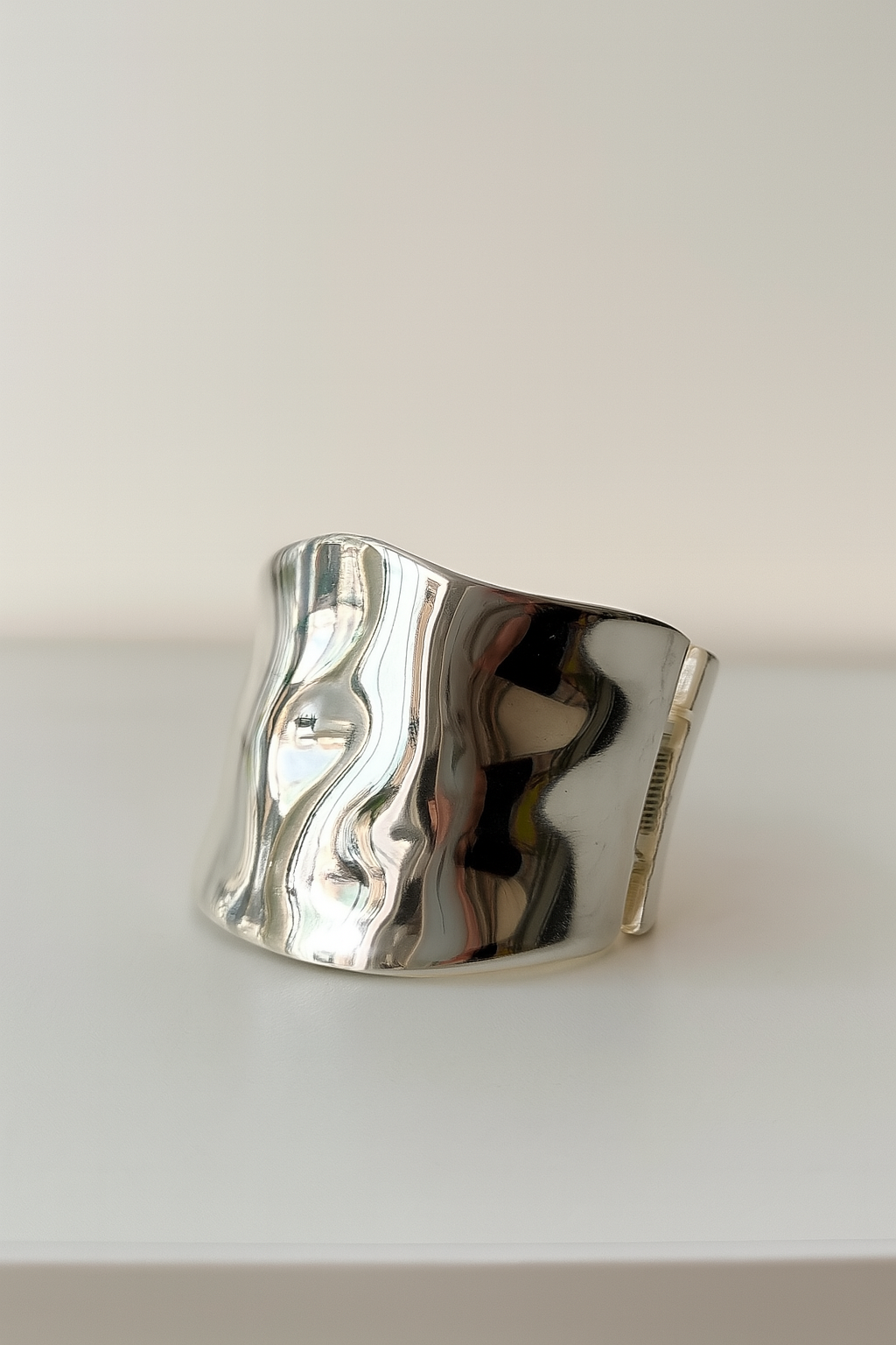 This wide bangle features a subtle hammered texture and a convenient side hinge for easy wear. It is broader in the middle and gently narrows toward the hinge, offering both style and comfort.